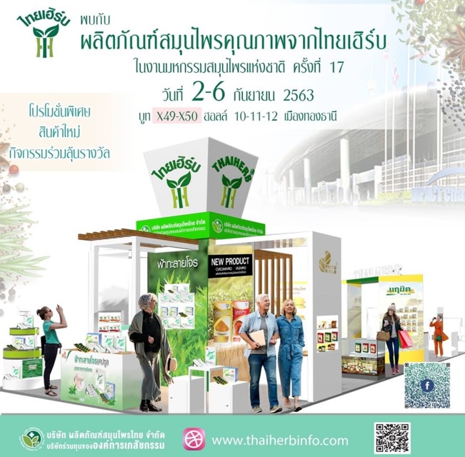 บริษัท ผลิตภัณฑ์สมุนไพรไทย จำกัด บริษัทร่วมทุนขององค์การเภสัชกรรม (ไทยเฮิร์บ) เตรียมขนสินค้าสมุนไพรของบริษัท อาทิ ฟ้าทะลายโจร นฤมิต เครื่องดื่มสมุนไพรจากขิง เห็ดหูหนู พุทราจีน ไทยเฮิร์บเฟรซ ลูกอมสมุนไพรรสชาติต่าง ๆ พร้อมเปิดตัวสินค้าใหม่ เคอร์คูมินโปร และลินชี่โปร ผลิตภัณฑ์เสริมอาหารสมุนไพรและโปรไบโอติก ภายในงาน กว่า 60 รายการ เข้าร่วมงาน มหกรรมสมุนไพรแห่งชาติ โดยเตรียมพบกับโปรโมชั่นสินค้าราคาสุดพิเศษนาทีทอง 1 แถม 1 และกิจกรรมต่างๆภายในบูธของไทยเฮิร์บ โดยภายในงานยังพบกับบูธแสดงสินค้าสมุนไพรคุณภาพสุดพรีเมี่ยมจากทั่วฟ้าเมืองไทย จากสมาชิกผู้ประกอบการของกรมการแพทย์แผนไทยฯ อีกมากมาย ในระหว่างวันที่ 2-6 กันยายน 2563 ณ ศูนย์การแสดงสินค้าและการประชุม อิมแพ็ค อารีน่า เมืองทองธานี บูท X49-X50 ฮอลล์ 10-12