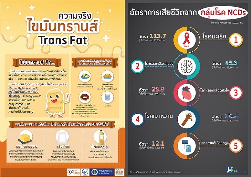 4 ใน 5 ลำดับแรกของสถิติการเสียชีวิตของคนไทย เริ่มต้นมาจากโรคที่เกิดจากการบริโภคและการสะสมของไขมันทรานส์นั่นเอง สืบเนื่องมาจากการใช้ชีวิตประจำวันและพฤติกรรมการกิน เช่น การทำงานหนัก การกินอาหารจังก์ฟู้ดที่ให้พลังงานมากเกินความจำเป็นและไม่มีคุณภาพทางโภชนาการ การดื่มเครื่องดื่มที่มีความหวาน ไขมันและคอเลสเตอรอลในปริมาณมาก แม้สั่งแบบหวานหรือไม่หวาน พนักงานก็ยังคงใส่น้ำเชื่อมหรือน้ำตาลให้เราอยู่ดี แต่แค่ในปริมาณที่น้อยกว่าเดิมเท่านั้นเอง ถึงเวลาที่เราจะดูแลสุขภาพกันแล้วหรือยัง