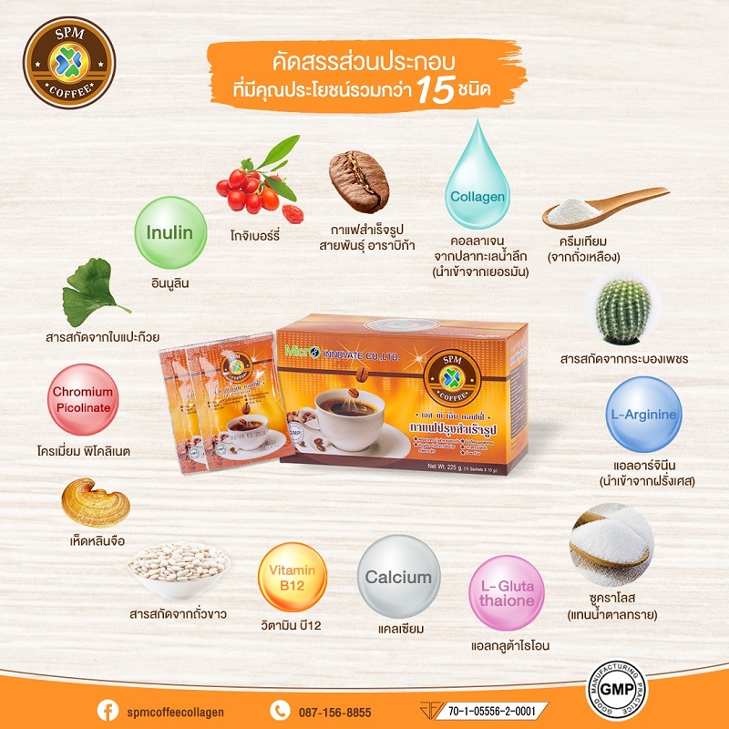 SPM Coffee กาแฟที่เป็นมากกว่ากาแฟสำเร็จรูปทั่วไป เพราะมีส่วนช่วยในการบำรุง ฟื้นฟูและดูแลสุขภาพให้แข็งแรงพร้อมทั้งดูแลร่างกายให้สดชื่น กระปรี้กระเปร่าได้ตลอดวัน ด้วยสารสกัดจากธรรมชาตินานาชนิด ที่ได้รับการคัดสรรแล้วว่ามีคุณสมบัติในการบำรุงและปรับสมดุลร่างกายโดยรวม อย่างเช่น คอลลาเจนจากปลาทะเลน้ำลึกที่มีส่วนช่วยในการบำรุงผิวพรรณ สารสกัดจากถั่วขาวที่ช่วยย่อยคาร์โบไฮเดรต ช่วยย่อยแป้งให้มีขนาดโมเลกุลเล็กลง ดึงไขมันเก่าที่สะสมมาเผาผลาญ ทำให้ไขมันในร่างกายลดลง สารสกัดจากเห็ดหลินจือที่มีส่วนช่วยระบบไหลเวียนเลือดในร่างกาย ขจัดสารพิษ บรรเทาภูมิแพ้และมีส่วนช่วยในการชะลอความแก่ สารสกัดจากโกจิเบอรี่ที่มีส่วนช่วยในการบำรุงสายตา มีไฟเบอร์สูง ป้องการอัลไซเมอร์ได้ มั่นใจได้ว่าถึงแม้จะดื่มเป็นประจำทุกวันก็ยังไม่เป็นอันตรายต่อร่างกาย ไม่มีไขมันทรานส์ ไม่มีน้ำตาล ไม่มีคอเลสเตอรอล ทำให้มีผิวพรรณผ่องใส อารมณ์ดี ยังช่วยให้ระบบขับถ่ายเป็นปกติอีกด้วย