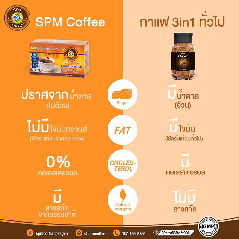 SPM Coffee เป็นอีกทางเลือกหนึ่งที่ตอบโจทย์สำหรับคอกาแฟที่รักสุขภาพในยุคนี้ นอกจากรสชาติที่อร่อย หอม กลมกล่อมจากเมล็ดกาแฟสายพันธุ์อาราบิก้าที่มีคาเฟอีนต่ำ แต่ให้ความหอมละมุนแล้ว ยังมีสารสกัดจากโกจิเบอร์รี่, สารสกัดจากถั่วขาว, ครีมเทียมจากถั่วเหลือง, เห็ดหลินจือ, สารสกัดจากใบแปะก๊วย, สารสกัดจากกระบองเพชร, ซูคราโลส(สารให้ความหวานแทนน้ำตาลทราย) รวมไปถึงไฟเบอร์ที่เป็นประโยชน์ในการช่วยบำรุงรางกายอีกด้วย บอกได้เลยว่าเพียงแค่คุณดื่ม SPM Coffee 1 แก้ว ก็จะได้รับคุณประโยชน์ไปเต็มๆ ที่สำคัญคือผู้ที่เป็นเบาหวานและความดันสามารถดื่มได้โดยไม่มีอาการข้างเคียงใดๆ