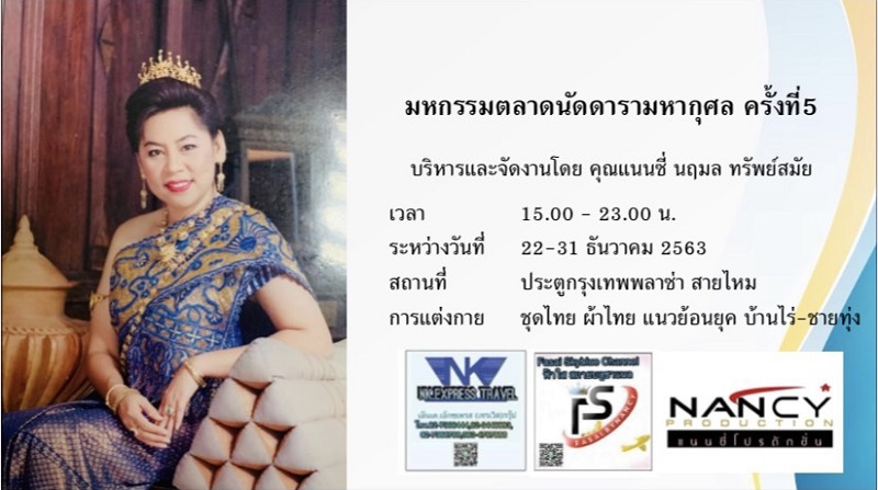 อีกไม่กี่วันก็จะถึงงานมหกรรมสินค้าและตลาดนัดดารามหากุศลครั้งที่ 5 จัดโดย แนนซี่ ทรัพย์สมัย ผู้บริหารฟ้าใสสกายบลูชาแนล และ เอ็นเค.เอ็กซเพรสเทรเวิล จัดงานบุญเนื่องในโอกาสฟ้าใสในโครงการปันของให้น้อง ครบรอบ14ปี จัดงานที่ตลาดประตูกรุงเทพ วันที่ 22-31 ธันวาคม 2563 เวลา 15.00 – 23.00 น.