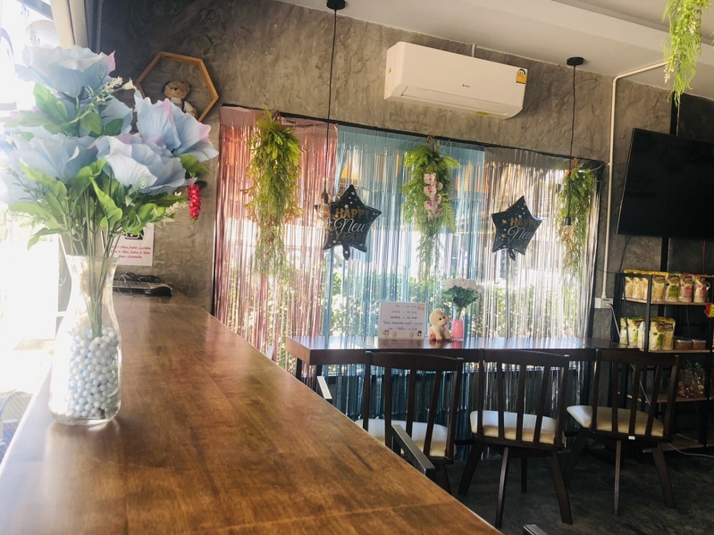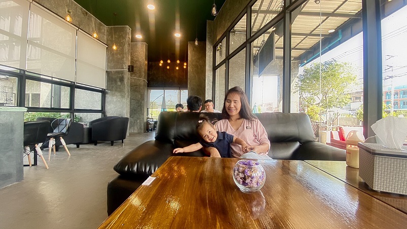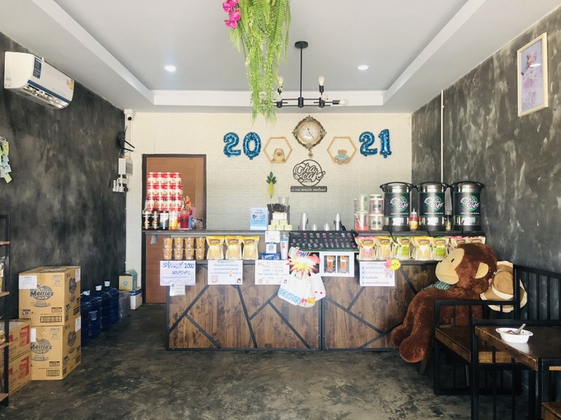 จากพักงานเขียนเมย์มาเปิดร้านกาแฟค่ะ ชื่อร้าน ‘ชา คาเฟ่’ เปิด 9.00-17.00 น. เมย์ลงมือชงเองเลยค่ะ (ยิ้ม) ร้านพอดีซื้อแฟรนไชส์เค้าเลยสอนชงให้ตั้งแต่แรก ส่วนขนมเมย์รับมาขายทั้งหมดค่ะ ยังไม่มีเวลาทำเอง อนาคตไม่แน่อาจทำเองค่ะ ซึ่งร้านกาแฟเปิดมาตั้งแต่เมษายน 63 จนถึงตอนนี้ก็ 8 เดือนได้แล้วค่ะ จะบริการเฉพาะเครื่องดื่มและขนม ส่วนขนมจะเป็นแห้ง ๆ ที่เก็บได้นาน เค้กคนแถวนี้ไม่ค่อยนิยม อายุการเก็บรักษาสั้น เสียง่ายเลยไม่เอามาลงค่ะ ช่วงเศรษฐกิจที่โควิดระบาดทำให้ยอดขายตกลงพอสมควรค่ะ แต่เพราะค่าเช่าที่ไม่แพงมาก อาคารที่ปลูกสร้างเป็นของเราลงทุนแบ่งให้คนเช่า 2 ห้องเลยลดต้นทุนค่าเช่าค่าน้ำไฟไปได้เยอะเลยพอเลี้ยงลูกได้สบาย ๆ มีเก็บบ้างนิดหน่อยค่ะ