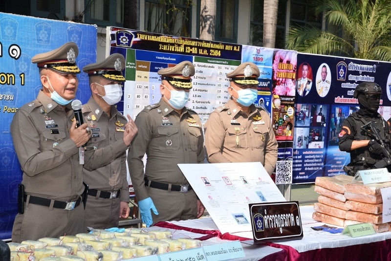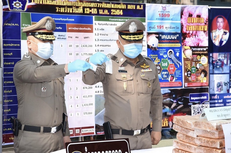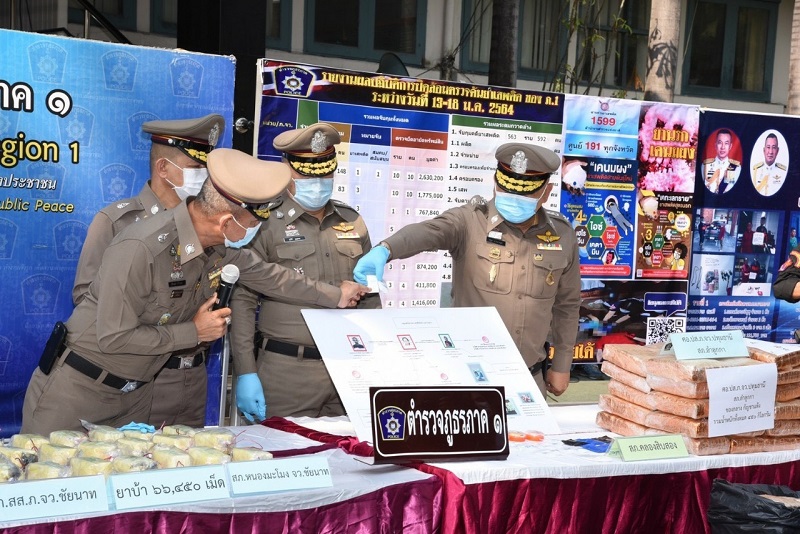 ร่วมแถลงข่าวปฏิบัติการระดมปิดล้อม ตรวจค้นเครือข่ายนักค้ายาเสพติดรายสำคัญ ระหว่างวันที่ 13–18 ม.ค.64 โดยมีผลการจับกุมผู้ต้องหา 592 ราย ยึดของกลางยาเสพติดจำนวนมาก และตรวจยึดทรัพย์สินรวมมูลค่า 8,644,825 บาท ณ บริเวณหน้าอาคาร ภ.1