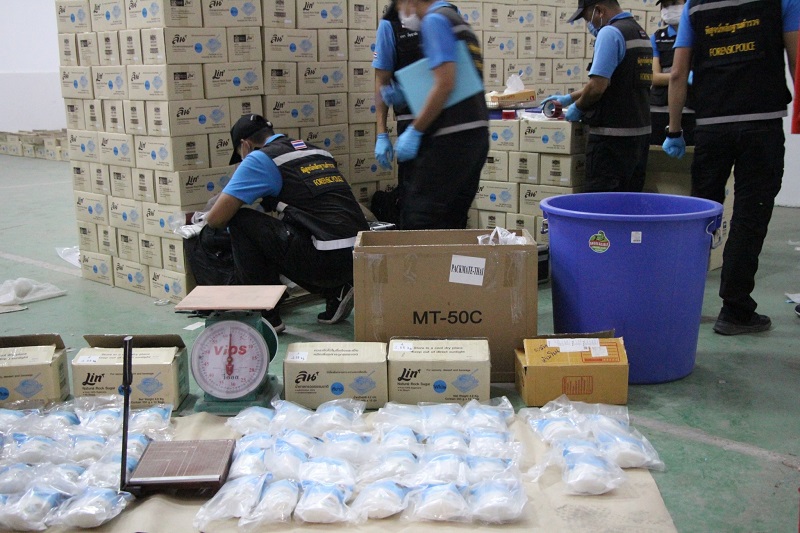 วันที่ 12 ก.พ.64 เวลา 20.30 น. พล.ต.ท.มนตรี ยิ้มแย้ม ผู้บัญชาการตำรวจปราบปรามยาเสพติด (ผบช.ปส.) พร้อมเจ้าหน้าที่ตำรวจ ปส. และ เจ้าหน้าที่ตำรวจสภ.บางบัวทอง แถลงผลจับกุมคดียาเสพติดรายสำคัญ โดยร่วมกันเข้าตรวจค้นโกดัง ถนนบางกรวย-ไทรน้อย ตำบล/เขตบางบัวทอง จ.นนทบุรี พบของกลาง ยาไอซ์ประมาณ 20 กิโลกรัม บรรจุอยู่ในถุงน้ำตาลทราย ปิดผนึกอย่างดี รอส่งมอบให้ลูกค้าเพื่อส่งขายต่อไปยังต่างประเทศ พร้อมเครื่องมือในการบรรจุซุกซ่อนยาเสพติด เพื่ออำพรางปะปนไปกับสินค้าน้ำตาลกรวด และเอกสารในการนำส่งน้ำตาลกรวด ไปประเทศออสเตรเลีย เมื่อประมาณเดือน พ.ย.2563