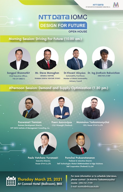 ภูวนาท เทียนเนียม BUSINESS DEVELOPMENT DIRECTOR บริษัท NTT DATA IOMC ผู้นำนวัตกรรม และโซลูชั่นจากประเทศญี่ปุ่น ร่วมกับ บริษัท เฮาส์ออฟเอ็ม จำกัด จัดงานแถลงข่าว “NTT DATA Institute of Management Consulting, Inc., NTT DATA IOMC Open House – DESIGN FOR FUTURE” เปิดตัวนวัตกรรมและโซลูชั่นจากประเทศญี่ปุ่น พร้อมเผยถึงทิศทางการดำเนินงานของบริษัทฯ ด้วยการนำโซลูชั่นอัจฉริยะถึง 3 ด้าน มาเพื่อทำให้หน่วยงานภาคธุรกิจเอกชนและอุตสาหกรรมต่าง ๆ สามารถพร้อมรับมือกับการเปลี่ยนแปลงในยุค NEXT NORMAL พร้อมเชิญผู้เชี่ยวชาญในการประยุกต์ใช้นวัตกรรมและโซลูชั่น มาร่วมบรรยายพิเศษถึงทิศทางการดำเนินธุรกิจอย่างยั่งยืน ด้วยการนำโซลูชั่นอัจฉริยะมาประยุกต์ใช้ในองค์กร ในวันพฤหัสบดีที่ 25 มีนาคม 2564 เวลา 10.00น. เป็นต้นไป ณ ห้องบอลรูม โรงแรมคอนราด กรุงเทพ
