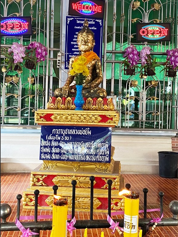 แล้วก็มาจุดที่ 2 วิหารหลวงพ่อยิ้ม เป็นพระพุทธรูปแกะสลักด้วยไม้สักทอง เชื่อว่าลอยน้ำมา แต่มาจากแห่งใดที่ไหนไม่มีใครทราบ ลอยน้ำมาติดอยู่ที่หน้าวัดนางกุยเมื่อ 100 กว่าปีที่ผ่านมาพอทางวัดพบเจอก็อัญเชิญประดิษฐานในอุโบสถแล้วลงรักษ์ปิดทองเดิมทีเรียก หลวงพ่อยิ้มแฉ่ง ตามพุทธลักษณะที่เห็นพระพักตร์สดใสยิ้มแฉ่ง ทุกวันนี้เรียก “หลวงพ่อยิ้ม” สั้นๆ แล้วทางวัดนางกุยได้จัดสร้างวิหารให้ประดิษฐาน