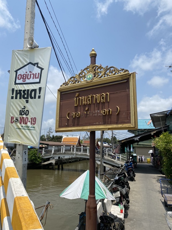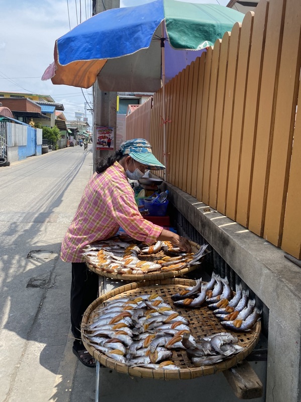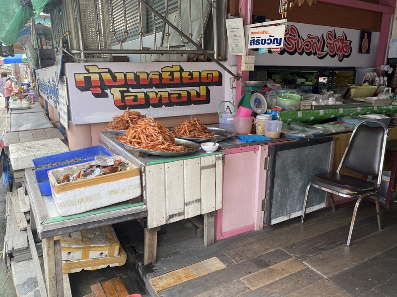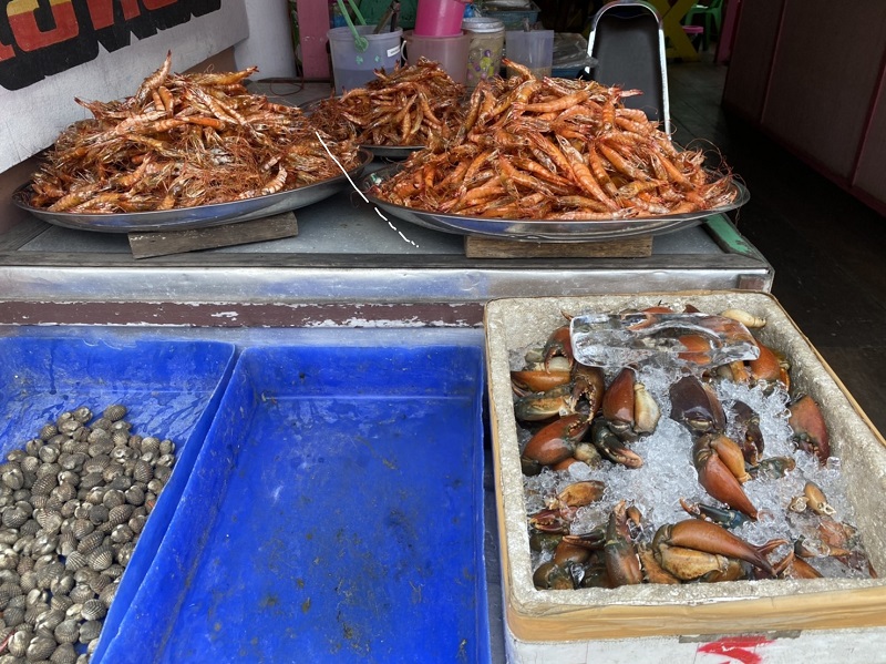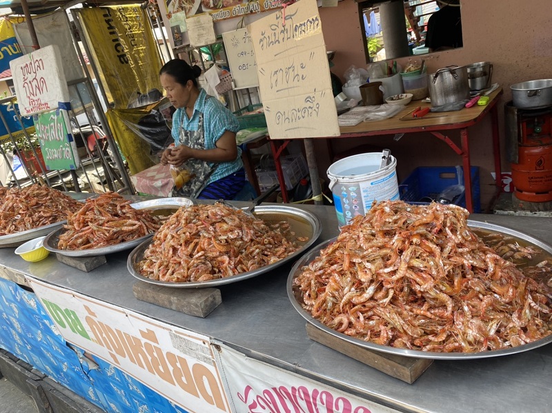 ก่อนจะไปถึงเรื่องเล่าขานถึงที่มาของชื่อบ้านสาขลา อีกตำนานหนึ่ง ผมขอคั่นโฆษณาแนะนำของดีของอร่อยของบ้านสาขลาสักหน่อยนะครับ ด้วยว่าชุมชนนี้เป็นหมู่บ้านประมงพื้นบ้านออกจับกุ้งหอยปูปลาปากอ่าวไทยเขตปากน้ำสมุทรปราการ ซึ่งในคลองแถบนี้มีกุ้งตะกาดตัวเล็กตัวใหญ่มากมายจริงๆ จับกุ้งมาแล้วก็ยังขายไม่หมด ก็เลยต้องช่วยกันคิดทำกุ้งเพื่อถนอมอาหาร นั่นคือการทำ “กุ้งเหยียด” ขายที่ตลาดนัดในหมู่บ้าน กระทั่งต่อมากุ้งเหยียดก็เป็นสินค้าขายดี เป็นของขึ้นชื่อของบ้านสาขลาจนกลายเป็นสินค้าชุมชนที่ผู้คนรู้จักและนิยมซื้อไปเป็นของฝาก กุ้งเหยียด บ้านสาขลา นี้ตัวกุ้งเหยียดตรง รสชาติจะออกหวานคล้ายกุ้งหวาน ใครไปเที่ยวบ้านสาขลาแล้วไม่ซื้อหาเป็นของฝากเสียดายแน่นอนครับ