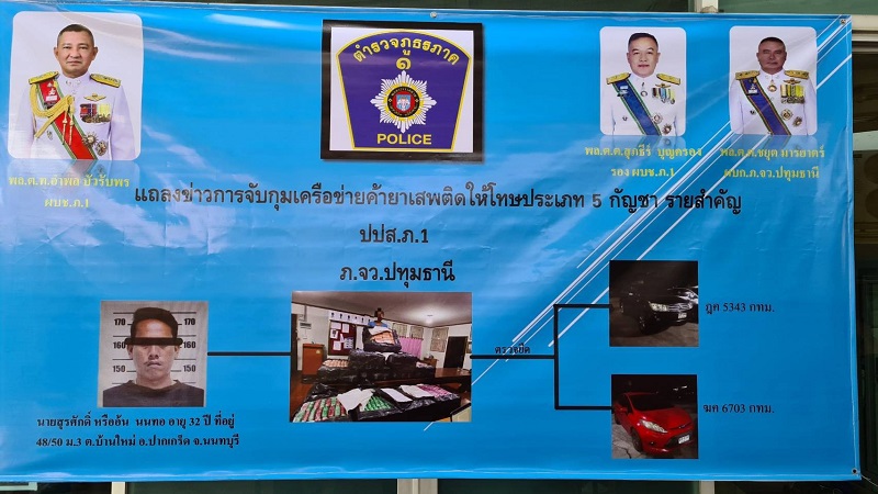 เมื่อ(วันศุกร์ที่ 2 เมษายน 2564) เวลา 14.30 น. : พล.ต.ท.อำพล บัวรับพร ผบช.ภ.1, พล.ต.ต.สุรพล เปรมบุตร รอง ผบช.ภ.1, พล.ต.ต.สุภธีร์ บุญครอง รอง ผบช.ฯ, พล.ต.ต.ชยุต มารยาทตร์ ผบก.ภ.จว.ปทุมธานี, พ.ต.อ.ศุภากรณ์ จันทราบุตร รอง ผบก.สส.ภ.1, หน.ชปส.ภ., พ.ต.อ.ปัณณพัฒน์ เดชโชติพิสิฐ ผกก.สภ. เมืองปทุมธานี, และ จนท.ที่เกี่ยวข้อง ร่วมแถลงการณ์ผลงานการจับกุมผู้ต้องหา นายสรุศักดิ์ หรืออ้น นนทอ อายุ 32 ปี พร้อมของกลาง