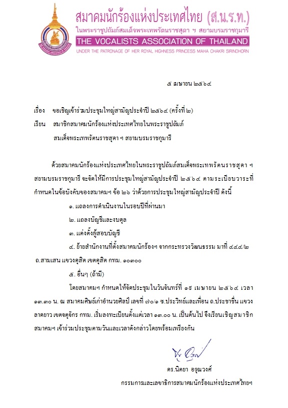 ซึ่งสมาคมนักร้องแห่งประเทศไทยในพระราชูปถัมภ์ สมเด็จพระเทพรัตนราชสุดาฯ ได้ขอแจ้งพร้อมเรียนเชิญสมาชิกสมาคมฯ เข้าร่วมประชุมในวันจันทร์ที่ 19 เมษายน 2564 เวลา 13.30 น. ณ สมาคมศิษย์เก่าอำนวยศิลป์ เลขที่ 70/1 ซอยประวิทย์ และเพื่อน ถนนประชาชื่น แขวงลาดยาว เขตจตุจักร กทม. เริ่มลงทะเบียนตั้งแต่เวลา 13.00 น. เป็นต้นไป จึงเรียนเชิญสมาชิก สมาคมฯ เข้าร่วมประชุมตามวันและเวลาดังกล่าวโดยพร้อมเพรียงกัน