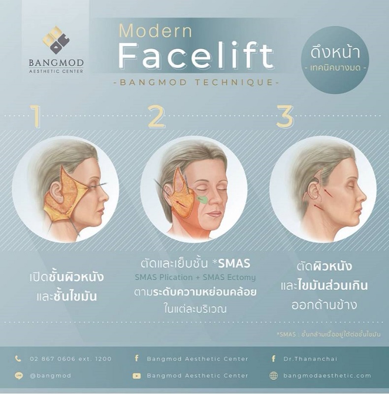 “New Modern Facelift 2021 เป็นเทคนิคใหม่ของทางศูนย์ศัลยกรรมความงาม รพ.บางมด ซึ่งได้มีการพัฒนาเทคนิคการศัลยกรรมมาอย่างต่อเนื่องกว่า 40 ปี เทคนิคนี้เป็นการผสมผสานการผ่าตัดดึงหน้าในชั้นลึก (Modern Facelift with SMAS Technique) ร่วมด้วยเทคนิคการเติมเต็มใบหน้า และร่องต่างๆ ด้วยไขมันตัวเอง (Fat grafting) และการปรับสภาพผิวหน้าด้วยพลาสม่า (PRP) จึงสามารถตอบโจทย์ทุกปัญหาของใบหน้าที่ดูมีอายุได้ ทำให้ใบหน้าดูอ่อนวัยลงอย่างเป็นธรรมชาติ แก้ไขทั้งความหย่อนคล้อย ใบหน้าดูเติมเต็มมีความอ่อนเยาว์ และพัฒนาคุณภาพผิวหน้าไปพร้อมๆ กัน ในการผ่าตัดเพียงครั้งเดียว”