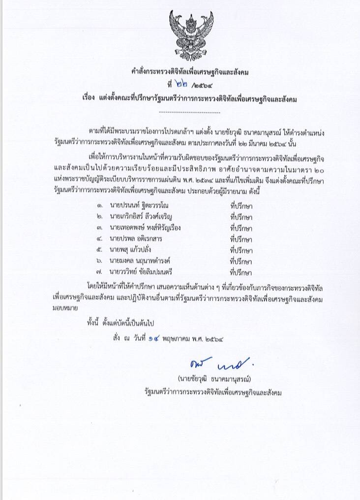 โดยมีหน้าที่ให้คำปรึกษา เสนอความเห็นด้านต่างๆ ที่เกี่ยวข้องกับภารกิจของกระทรวงดิจิทัลเพื่อเศรษฐกิจและสังคม และปฏิบัติงานอื่นตามที่รัฐมนตรีว่าการกระทรวงดิจิทัลเพื่อเศรษฐกิจและสังคมมอบหมาย ทั้งนี้ตั้งแต่บัดนี้เป็นต้นไป สั่ง ณ วันที่ 14 พฤษภาคม พ.ศ.2564
