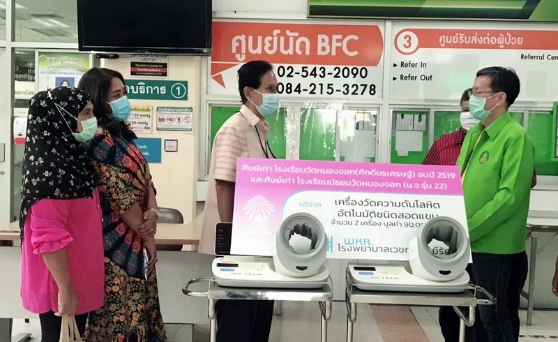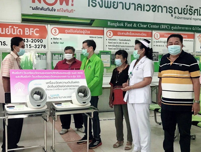 วันเสาร์ที่ 12 มิถุนายน 2564 เวลา 10.30 น. นายแพทย์สุรชัย ภูพิพัฒน์ผล ผู้อำนวยการโรงพยาบาลเวชการุณย์รัศมิ์ และ อุษา บุญรอด พยาบาลวิชาชีพชำนาญการ ประจำ โรงพยาบาลเวชการุณย์รัศมิ์ รับมอบเครื่องวัดความดันโลหิตอัตโนมัติชนิดสอดแขนจำนวน 2 เครื่อง มูลค่า 90,000.- บาท( เก้าหมื่นบาทถ้วน) จาก อ.อรุณ พ่วงสมบัติ อดีต ผอ.เขตมีนบุรี และ อ.โสภา รัตนาบดี เพื่อใช้ในการให้บริการประชาชนในสถานการณ์การแพร่ระบาดของโรคโควิด-19 ของเขตหนองจอก ซึ่งกิจกรรมทำความดีครั้งนี้ประสบความสำเร็จตามวัตถุประสงค์ เนื่องจากได้รับความร่วมมือเป็นอย่างดี จากบรรดาศิษย์เก่าและคณะครูโรงเรียนวัดหนองจอก(ภักดีนรเศรษฐ์)จบปี 2519 และศิษย์เก่าโรงเรียนมัธยมวัดหนองจอก(น.จ.รุ่น 22) นำโดย อัญชลี คล้ายปักษี, กิตติ ตรงไตรรัตน์, มยุรี บัตรประทาน, ชูชาติ เลี้ยงบำรุง และประพันธ์ ประดับสุวรรณ ณ โรงพยาบาลเวชการุณย์รัศมิ์ เขตหนองจอก