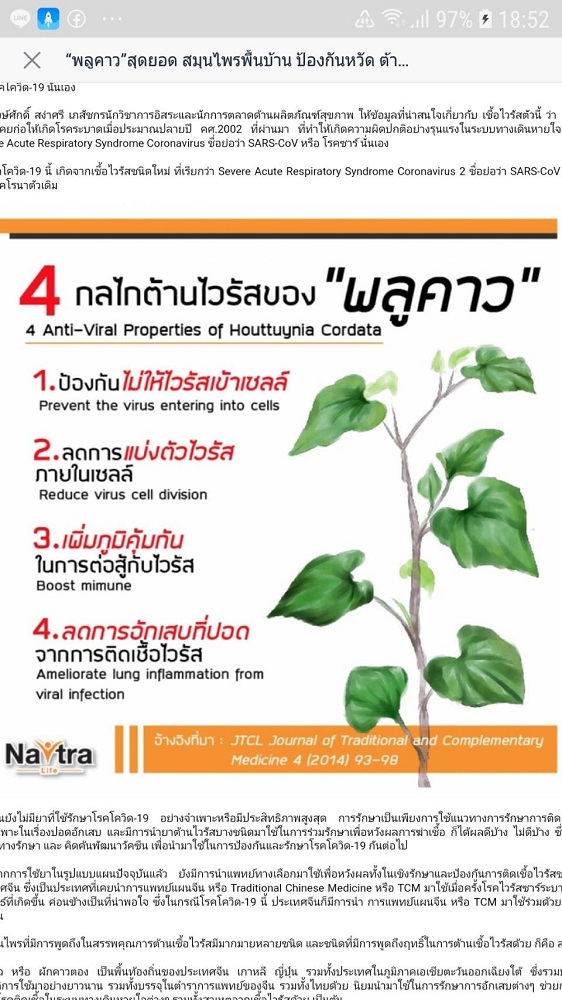 มีการแนะนำสมุนไพรไทย พลูคาว เพื่อเปิ่นทางเลือกในการป้องกันและฆ่าเชื้อไวรัส