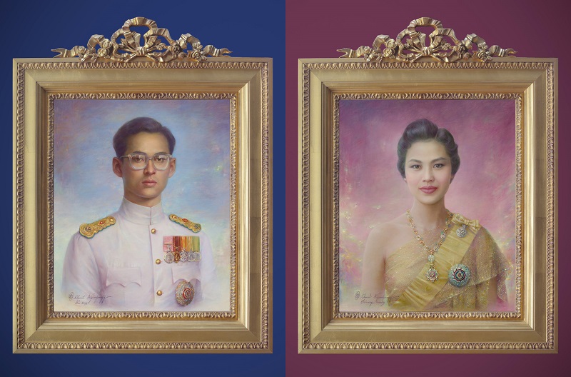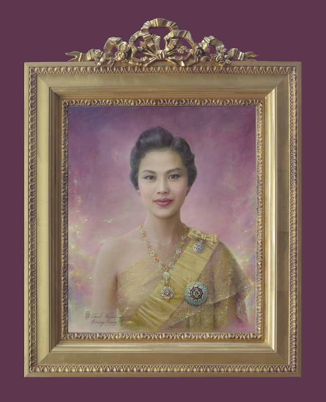 พระบรมรูปคู่ ‘ความทรงจำแห่งรัก ในหลวงรัชกาลที่ 9 และ สมเด็จพระบรมราชชนนี พันปีหลวง’ ชูศิษฐ์ได้วาดพระบรมสาทิสลักษณ์ สมเด็จพระบรมราชชนนี พันปีหลวง ด้วยโครงสีทองพื้นชมพูอันเป็นโทนสีแห่งความอบอุ่นเลอค่า เราจะสังเกตเห็นการวาดแววพระเนตรและพระพักตร์ด้วยความละเมียดละไม งดงามลึกซึ้งราวกับมีชีวิต ซึ่งสิ่งนี้ถือเป็นซิกเนเจอร์สำคัญในการทำงานศิลปะของเขาที่หาตัวจับยาก การเน้นมิติของรายละเอียดในการวาดเครื่องขัตติยราชอิสริยาภรณ์ ที่มีการทับซ้อนแทรกสีหลายเลเยอร์ ประกอบกับการจรดพู่กันการสานเส้นอย่างปราณีตเพื่อเพิ่มความโปร่งบางและการทิ้งตัวให้กับฉลองพระองค์กรองทองทรงสะพักอันบอบบางซับซ้อน อีกทั้งเสน่ห์ของบรรยากาศของสีที่มีความฟุ้งฝัน ล่องลอย ซ้อนด้วยเกล็ดแสงระยิบระยับ ถือเป็นอีกหนึ่งสุนทรียภาพแห่งความงามที่ยากจะละสายตามอง ส่วนประติมากรรมลายเถากุหลาบที่ผูกร้อยไว้ด้วยริบบิ้นบนกรอบทองนอกจากจะเพิ่มความหวานและสง่างามให้กับผลงานแล้ว ยังมีความหมายอันลึกซึ้งที่แสดงถึงความรักอันงดงามของทั้งสองพระองค์ที่ผูกพันอย่างไม่มีวันเสื่อมคลายปราศจากกาลเวลา ในขณะที่ริบบิ้นซ้อน 3 ชั้นผูกปมสลักสัญลักษณ์เลขไทยเพื่อแสดงความรักและน้อมรำลึกถึงในหลวงรัชกาลที่ 9