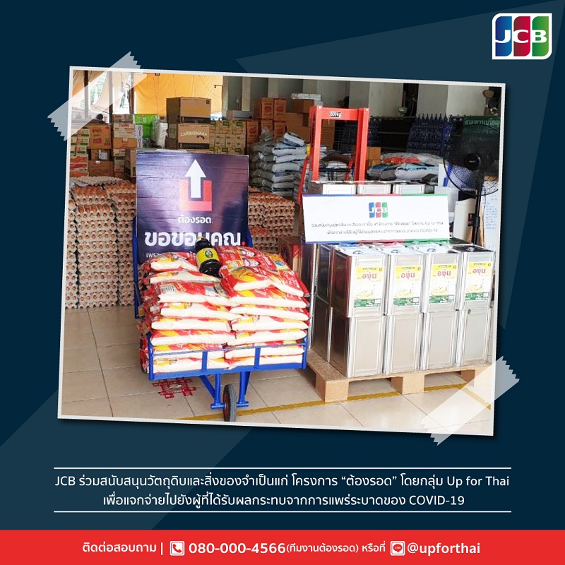 จากสถานการณ์แพร่ระบาดของ COVID-19 ในขณะนี้ทำให้ บริษัท เจซีบี อินเตอร์เนชั่นแนล (ประเทศไทย) จำกัด โดย “คุณเรียว โมริตะ” กรรมการผู้จัดการ ได้เล็งเห็นถึงความสำคัญของภาคเอกชนในการร่วมเป็นหนึ่งแรงสนับสนุน เพื่อช่วยบรรเทาความเดือดร้อนให้กับประชาชนในชุมชนที่ได้รับผมกระทบจาก COVID-19 โดยได้สนับสนุนวัตถุดิบและสิ่งของจำเป็นให้แก่โครงการต้องรอด โดยกลุ่ม Up for Thai ซึ่งเป็นกลุ่มอาสาสมัครเพื่อช่วยเหลือประชนชนที่ได้รับผลกระทบจากการระบาด โดยมีการจัดตั้งโรงครัวทำอาหาร และจัดเครื่องอุปโภคบริโภคให้แก่ชุมชน โรงครัวชุมชน แคมป์คนงาน ผู้กักตัว ผู้ป่วยติดเตียง ผู้พิการ คนชรา