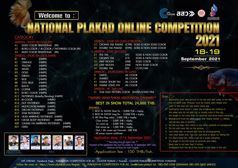 นายวีระพงศ์ มาลัย ผู้อำนวยการสำนักงานส่งเสริมวิสาหกิจขนาดกลางและขนาดย่อม ให้เกียรติ เป็นประธานเปิดการ ประกวดปลากัดนานาชาติ (NATIONAL PLAKAD ONLINE COMPETITION 2021) วันเสาร์ที่ 18 กันยายน 2564 เวลา 09.00 น. บนแอพพลิเคชั่น Youtube channel: Cluster Plakad Competition Thailand และ Youtube channel : คลัสเตอร์ปลากัดป่า ซึ่งการประกวดครั้งนี้ ถือเป็นการ จัดประกวดปลากัดออนไลน์ที่ใหญ่ที่สุดในประเทศไทย มีผู้ที่สนใจส่งปลากัดเข้าร่วมประกวด 1,590 ตัว แบ่งออกเป็นปลากัดป่า จำนวน 662 ตัว และปลากัดสวยงามจำนวน 928 ตัว เป็นปลาที่ส่งประกวดจาก 10 ประเทศ ได้แก่ ประเทศ สหรัฐอเมริกา, จีน, ญี่ปุ่น, เยอรมัน, แคนาดา, สิงคโปร์, มาเลย์เซีย, อินโดนีเซีย, ฟิลิปินส์ และ เวียดนาม การจัดประกวดดังกล่าวเป็นรูปแบบมิติใหม่ที่ช่วยยกระดับมาตรฐานการประกวดปลากัดสากลในรูปแบบออนไลน์ นอกจากจะเป็นการกระตุ้นให้เกิดการซื้อขายปลากัดไทยแล้ว ยังเป็นการขยายตลาด ปลากัดของไทยไปสู่สากล ผู้ที่เข้าชมจะได้ชมความสวยงามของปลากัดป่าดังเดิมที่ได้รับการพัฒนาให้มีสีสันและรูปทรงต่างๆ ที่ยังไม่เคยพบในการจัดประกวดมาก่อน และพาเหรดของปลากัดสวยงามที่จะมาประชันโฉมความงามของธงชาติไทยบนตัวปลากัด เพื่อมาหาสุดยอดปลากัดที่มีลายและสีเหมือนธงชาติไทยที่สุด การประกวดจะจัดขึ้นระหว่างวันที่ 18 – 19 กันยายน 2564 นี้
