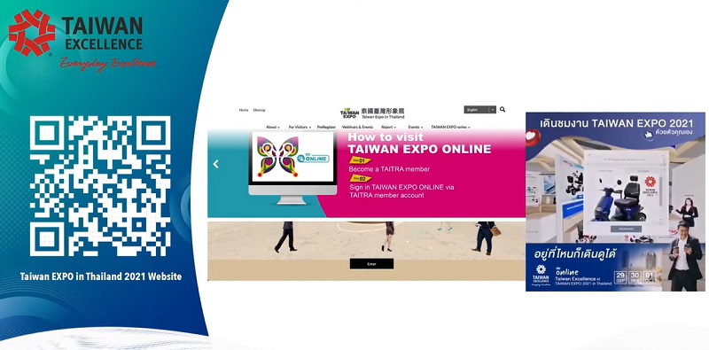 นอกจากงานสัมมนาออนไลน์นี้แล้ว ทั้ง 4 บริษัท ยังจัดแสดงผลิตภัณฑ์ในงาน “Taiwan Expo 2021 in Thailand online” ซึ่งจัดขึ้นระหว่างวันที่ 29 กันยายน ถึง 31 ต.ค. 2564 นอกจากนี้ ยังมีผลิตภัณฑ์ที่ได้รับรางวัล Taiwan Excellence Award อีก 39 ผลิตภัณฑ์มาร่วมจัดแสดง มีตั้งแต่ผลิตภัณฑ์ทางการแพทย์และด้านความงาม อุปกรณ์กีฬาและสันทนาการ ผลิตภัณฑ์สำหรับอุตสาหกรรม การขนส่ง ไปจนถึงฮาร์ดแวร์ต่างๆ โดยสามารถเข้าร่วมงานได้ที่เว็บไซต์ https://thai.taiwanexpoasean.com/en/index.html (เว็บไซต์เปิดให้เข้าชมงานตั้งแต่ 22 ก.ย. ถึง 29 ต.ค.)