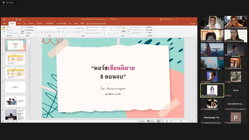 ปัจจุบันมีอายุงานเขียนเข้าปีที่ 12 นับจากนิยายเรื่องแรกที่ได้ตีพิมพ์นะคะ ส่วนการสอนเนี่ย สอนจริง ๆ จัง ๆ เพิ่งจะเริ่มปีนี้ แต่ก่อนหน้านั้นมีรับงานวิทยากรไปบรรยายตามสถานศึกษาต่าง ๆ อยู่หลายครั้ง ช่วงนั้นก็จะมีอายุงานราว 9-10 ปี ถ้าถามว่าเปิดสอนเขียนนิยายมีดราม่าบ้างไหม มันก็มีบ้างค่ะ แต่บางทีเราก็รู้ บางทีเราก็ไม่รู้ ตอนที่รู้ก็แกล้งทำเป็นไม่รู้ (หัวเราะ) เพราะเราต้องยอมรับว่าทุกวงการย่อมมีกระแสตอบรับทั้งทางบวกและลบตามมาเสมอ ไม่ใช่แค่วงการนักเขียนอย่างเดียว ส่วนตัวหนูแดงเวลาได้รับฟีดแบ็กในทางลบก็ไม่ได้อะไรค่ะ แค่น้อมรับผลตอบรับในทุก ๆ ทาง อะไรที่เห็นว่ามีประโยชน์ก็เอาไปปรับปรุงในการสอนครั้งต่อ ๆ ไปค่ะ จากที่ทำงานมาหลายอย่างที่กล่าว หนูแดงชอบงานเขียนที่สุดค่ะ ย้ำว่างานเขียนนิยายหรือพวกวรรณกรรมด้วยนะคะ เพราะรู้สึกว่าเป็นตัวเองมากที่สุด ยุ่งกับคนอื่นน้อยสุดด้วยค่ะ บางครั้งเราก็ต้องการชาร์จแบตฯ ด้วยการใช้เวลาอยู่กับตัวเองคนเดียวเงียบ ๆ ใช้ความคิด ใช้จินตนาการไปเรื่อยเปื่อย มันเป็นการบำบัดตัวเองอย่างหนึ่งด้วยงานเขียนเนี่ย ส่วนพวกงานสอน จริง ๆ ตอนแรกที่สอน สอนเพราะอยากคุยกับคนค่ะ ช่วงโควิดที่ผ่านมาไม่ได้ออกจากบ้านไปเจอสังคมที่ไหนเลยผุดไอเดียที่จะทำให้ได้คุยกับคนขึ้นมาด้วยการเปิดสอน ให้คนที่สนใจในเรื่องเดียวกันมาพูดคุยกัน สอนเป็นงานอดิเรกไป ๆ มา ๆ นักเรียนมีการบอกต่อกัน ก็เลยเปิดสอนจริง ๆ จัง ๆ ไปเป็นงานเสริม ส่วนงานเพลง จริง ๆ แล้วเป็นความฝันตั้งแต่วัยเด็กเลยค่ะ หนูแดงเคยจะเดบิวท์อยู่ครั้งหนึ่งตอนสมัยวัยรุ่นแล้วไม่ได้ไปต่อ เพิ่งกลับมาสานต่อความฝันในช่วงอายุนี้ แล้วก็ต้องยอมรับว่าเราร้องเพลงไม่เหมือนเดิมแล้วนะ ด้วยข้อจำกัดทางร่างกาย น้ำเสียงที่เปลี่ยนไป และปัจจัยอื่น ๆ อีก เลยคิดว่างานเขียนนี่แหละเป็นตัวเองที่สุดแล้วในช่วงอายุนี้ค่ะ มาคุยถึงงานสอนเขียนนิยายถ้านับตั้งแต่ที่เริ่มได้รับเชิญไปเป็นวิทยากรก็ราว 5 ปีแล้วค่ะ แต่ถ้าสอนจริง ๆ จัง ๆ ก็ยังไม่ถึงปีเพราะเพิ่งเริ่มปีนี้ ช่วงแรก ๆ ไม่มีค่าใช้จ่ายในการสอนอะไร สไลด์ทำเอง เพจทำเอง ประชาสัมพันธ์คลาสเรียนเอง ซึ่งช่วงหลังมีทีมงานเข้ามาช่วยงานก็จะมีค่าใช้จ่ายส่วนนี้เข้าไปด้วย ระยะแรกเริ่มรับสอนคลาสเล็ก ๆ 10-15 คน เป็นพวกคลาส Workshop ก็จะรับนักเรียนได้น้อย แต่ถ้าเป็นคลาสบรรยาย จำนวนนักเรียนสูงสุดก็ราว 100 กว่าคน ตอนนั้นไปเป็นวิทยากรแล้วบรรยายให้นักศึกษาปี 1 – ปี 4 ฟังน่ะค่ะ คลาสที่ทำเอง จำนวนนักเรียนสูงสุด 50 กว่าคนได