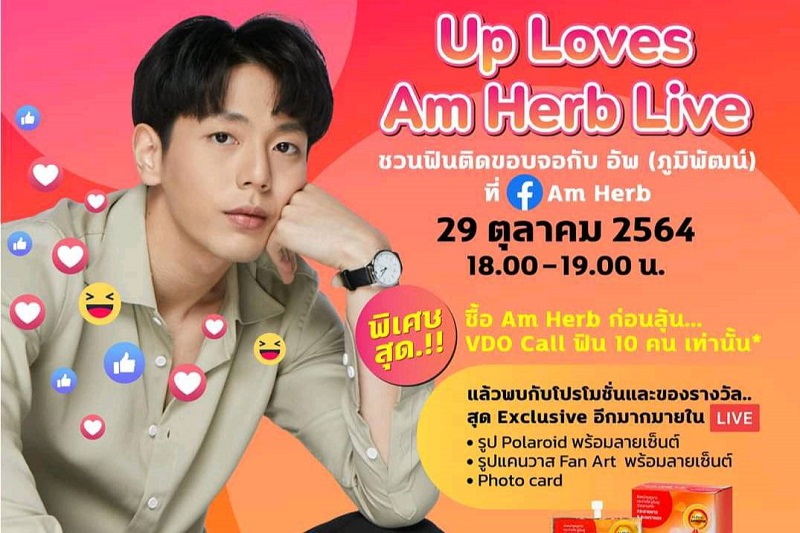 Up Love Am Herb Live พบกับการไลฟ์สด ของอัพ ภูมิพัฒน์ ในวันที่ 29 ตุลาคมนี้ เวลา 18.00 น. ถึง 19.00 น. นี้ ที่เพจ Facebook : Am Herb สาวๆจะได้ลุ้น VDO Call กับน้องอัพ และรับถุงผ้า, หมอนอิง, ภาพโพลารอยด์พร้อมลายเซ็น หรือภาพแคนวาสขนาดใหญ่พร้อมลายเซ็น รูปลาย Fan Art สุดต๊าชเอ็กซ์คลูซีฟจากแบรนด์อัมเฮิร์บเท่านั้น ไปเป็นที่ระลึกให้ฟินกันอีกด้วย สำหรับคุณสาวๆ ที่ซื้อผลิตภัณฑ์โปรโมชั่นสุดพิเศษของแบรนด์ Am Herb ร่วมลุ้นเข้าร่วมกิจกรรมนี้