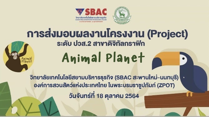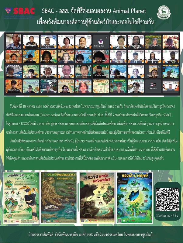 วันจันทร์ที่ 18 ตุลาคม 2564 องค์การสวนสัตว์แห่งประเทศไทย ในพระบรมราชูปถัมภ์ (อสส.) ร่วมกับ วิทยาลัยเทคโนโลยีสยามบริหารธุรกิจ (SBAC) จัดพิธีส่งมอบผลงานโครงงาน (Project design) ซึ่งเป็นผลงานของนักศึกษาระดับ ปวส. ชั้นปีที่ 2 ของวิทยาลัยเทคโนโลยีสยามบริหารธุรกิจ (SBAC) ในรูปแบบ E-BOOK โดยมี นายเชาวลิต ชูขจร ประธานกรรมการองค์การสวนสัตว์แห่งประเทศไทย พร้อมด้วย รศ.ดร.วรสัณฑ์ บูรณากาญจน์ กรรมการองค์การสวนสัตว์แห่งประเทศไทย ประธานอนุกรรมการด้านการตลาดผ่านสื่อสังคมออนไลน์ และผู้บริหารของทั้งสองหน่วยงานร่วมเป็นเกียรติในพิธี