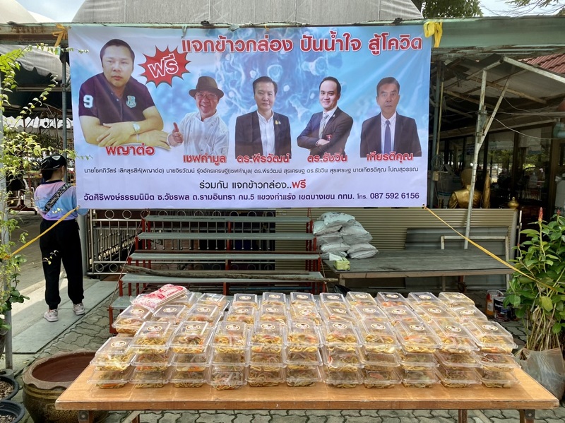 ซึ่งขณะนี้ รัฐบาลยังประกาศล็อกดาวน์ เนื่องจากการแพร่ระบาดของไวรัสโควิด-19 และยังมีผู้ติดเชื้ออยู่จำนวนมาก ส่งผลกระทบต่อทุกภาคส่วนธุรกิจและปัญหาการดำเนินชีวิตในกลุ่มของ”พญาต่อ” จึงได้มาร่วมกันแจกข้าวกล่องที่วัดศิริพงษ์ธรรมนิมิต ซอยวัชรพล แขวงท่าแร้ง เขตบางเขน กทม.ตั้งแต่เวลา 11 โมงเป็นต้นไป โดยมีเงื่อนไข ประชาชนคนทั่วไปสามารถมารับข้าวกล่องได้หนึ่งคนต่อหนึ่งกล่อง