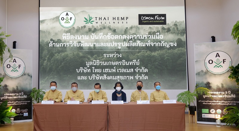 ณ ห้องประชุมประดู่แดง 1 มหาวิทยาลัยแม่ฟ้าหลวง บริษัทไทย เฮมพ์ เวลเนส จำกัด โดยนายแพทย์เกรียงศักดิ์ หลิวจันทร์พัฒนา ประธานบริษัท มูลนิธิวนเกษตรอินทรีย์ โดย นายดิเรก ตนพะยอม ประธานมูลนิธิฯ และ บริษัท สังคมสุขภาพ จำกัด (เลมอนฟาร์ม) โดย นางสุวรรณา หลั่งน้ำสังข์ กรรมการผู้จัดการ พร้อมด้วย ดร.เสฐียรพงษ์ แก้วสด ประธานเจ้าหน้าที่บริหาร บริษัท ไทย เฮมพ์ เวลเนส จำกัด พลเอกสุทัศน์ จารุมณี ประธานที่ปรึกษามูลนิธิวนเกษตรอินทรีย์ รองศาสตราจารย์ ดร.อภินันท์ สุวรรณรักษ์ รองประธานมูลนิธิวนเกษตรอินทรีย์ ได้ร่วมลงนามในบันทึกข้อตกลงความร่วมมือการวิจัยและพัฒนาผลิตภัณฑ์จากกัญชงเพื่อผลักดันสู่การพาณิชย์ต่อไป โดยมีนายวีรชาติ เขื่อนรัตน์ อดีตผู้ตรวจราชการกระทรวงเกษตรและสหกรณ์ ผู้ช่วยศาสตราจารย์ ดร.สุพจน์ บุญแรง ประธานหลักสูตรปริญญาโท สาขานวัตกรรมการจัดการวิสาหกิจการเกษตรและอาหาร คณะเทคโนโลยีการเกษตร มหาวิทยาลัยราชภัฏเชียงใหม่ ร่วมเป็นสักขีพยาน