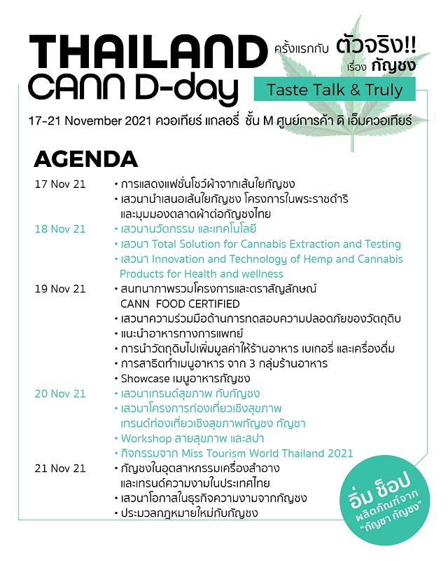 ประเดิมวันแรก 17 พ.ย. 64 พบกับการเปิดตัว และการแถลงข่าว “กัญชง พืชเศรษฐกิจใหม่ กับภารกิจปั้นไทยสู่ฮับแห่งเอเชีย” และการเดินแบบผ้ากัญชงและกิจกรรมสร้างองค์ความรู้ “จากฟ้าสู่ดิน” พร้อมนำเสนอสินค้าจากกัญชากัญชง โดย MISS TOURISM WORLD THAILAND 2021 และการเสวนาในหัวข้อ “เส้นใยกัญชงและโครงการในพระราชดำริ และมุมมองตลาดผ้าต่อกัญชงไทย” นำโดย ดร.วีระชัย ณ นคร ประธานกิตติมศักดิ์ สมาคมการค้าอุตสาหกรรมกัญชงไทย นักพฤกษศาสตร์ผู้มีประสบการณ์เกี่ยวกับพืชกัญชงมากกว่า 20 ปี และ ดร.สุรภีร์ โรจนวงศ์ นายกสมาคมการค้าส่งเสริมหัตถกรรมไทย อดีตประธานสภาหัตถกรรมโลกภูมิภาคเอเชียแปซิฟิก ผู้อยู่เบื้องหลังการผลักดันวงการหัตถกรรมไทย รวมไปถึงระดับโลก