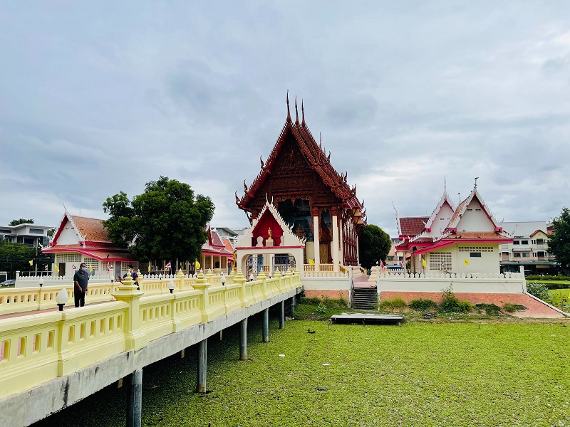 จุดที่ 1.พระอุโบสถกลางสระน้ำ ด้านหน้ามีทำมาศเก่าอยู่ให้ได้ชม ภายในพระอุโบสถประดิษฐานองค์พระประธานสร้างวัตถุคือหม้อน้ำเรือรบและใบเสมาคู่ พระพุทธรูปปางห้ามสมุทรสมัยขอม
