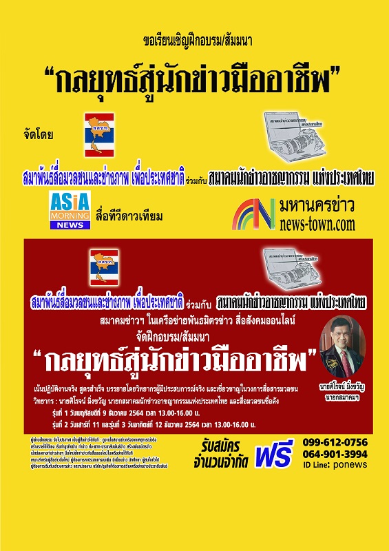 ในปี 2564 ทางสมาพันธ์ฯ ได้ดำเนินกิจกรรมที่เป็นประโยชน์ต่อสังคมอีกโครงการหนึ่ง คือ โครงการการฝึกอบรม/สัมมนา เพื่อส่งเสริมสนับสนุนงานด้านสื่อสารมวลชน เพื่อเสริมสร้างผู้สื่อข่าวมือใหม่ ผู้สื่อข่าวป้ายแดง ผู้ต้องการเริ่มต้นเข้าสู่วงการข่าว บางคนไม่รู้จะเริ่มต้นงานข่าวอย่างไร ขาดประสบการณ์ ไม่รู้จะไปปรึกษาใคร ไม่มีพวก ซึ่งปัญหาอุปสรรคเหล่านี้จะหมดไป จะแนะนำฝึกอบรมให้ปฏิบัติงานข่าวได้จริงอย่างง่ายๆ รวดเร็ว สามารถเริ่มงานข่าวได้ทันที สร้าง/เพิ่มเพื่อนข่าว พันธมิตรข่าว สร้างโอกาสและช่องทางข่าวใหม่ๆ หรืออยากจะทำธุรกิจข่าวก็ได้ โดยเน้นปฏิบัติงานจริงจากสนามข่าวในเหตุการณ์จริง และสูตรสำเร็จ โดยเปิดการฝึกอบรม/สัมมนาแบบเร่งรัดให้แก่ผู้สนใจทั่วไป ซึ่งต่อไปคาดว่าน่าจะเกิดศูนย์การเรียนรู้ พัฒนาประสบการณ์ ความรู้ความสามารถ แลกเปลี่ยนความคิดเห็นคนในวงการสื่อสารมวลชนได้ในระดับหนึ่ง