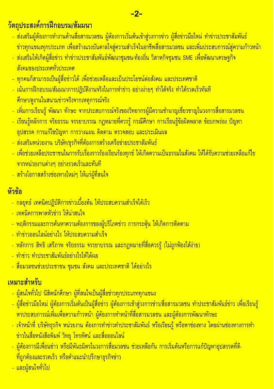 – เน้นการฝึกอบรม/สัมมนาการปฏิบัติงานจริงในการทำข่าวอย่างง่ายๆ ทำได้จริง ทำได้รวดเร็วทันที