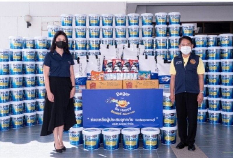 อมรรัตน์ ชัยยศบูรณะ ที่ปรึกษาประธานเจ้าหน้าที่บริหาร กลุ่มบริษัท เบเยอร์ จำกัด ส่งมอบถังยังชีพ จำนวน 1,000 ชุด ประกอบด้วย ข้าวสาร ปลากระป๋อง บะหมี่กึ่งสำเร็จรูป นมกล่อง ให้แก่ ณัฐภัทร สุวรรณประทีป ผู้ว่าราชการจังหวัดสุพรรณบุรี และทีมบรรเทาสาธารณภัย จังหวัดสุพรรณบุรี เพื่อนำไปกระจายความช่วยเหลือแก่ประชาชนผู้ประสบอุทกภัยในพื้นที่จังหวัดสุพรรณบุรี ตามนโยบายตอบแทนสังคมของสีเบเยอร์ ภายใต้โครงการ Beger Be Happy ณ ศาลากลางจังหวัดสุพรรณบุรี เมื่อวันก่อน