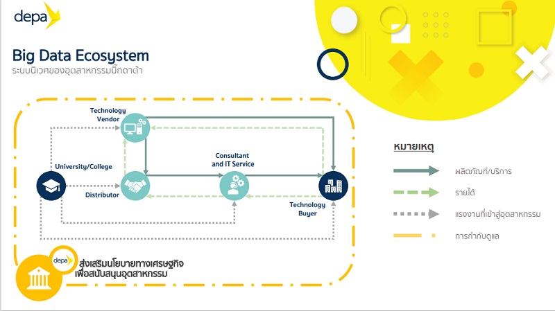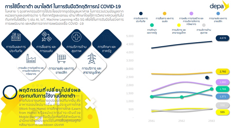 “สถานการณก์ารแพร่ระบาดของโรคติดเชื้อไวรัสโคโรนา2019(COVID-19)ส่งผลต่อพฤติกรรมผู้ใช้บริการ บิ๊กดาต้าในการใช้งานข้อมูลบนอินเตอร์เน็ตมากขึ้น ผู้ให้บริการจําเป็นต้องมีการจัดเก็บข้อมูลที่เกิดขึ้นในปริมาณมาก และสามารถนําข้อมูลที่ได้มาประมวลผลและปรับใช้ได้ทันท่วงที ด้วยเหตุนี้จึงทําให้ผู้พัฒนาและผลิตเทคโนโลยี (Technology Vendor) ต้องปรับเปลี่ยนแพลตฟอร์มการให้บริการบิ๊กดาต้าบนคลาวน์เพิ่มขึ้น ส่งผลให้ตลาดซอฟต์แวร์ และงานบริการยังคงเติบโตต่อเนื่อง เพราะยังมีการนําข้อมูลเข้ามาผ่านการประมวลผล เพื่อนําไปใช้งาน ต่อไป” ผู้อํานวยการใหญ่ ดีป้า กล่าว