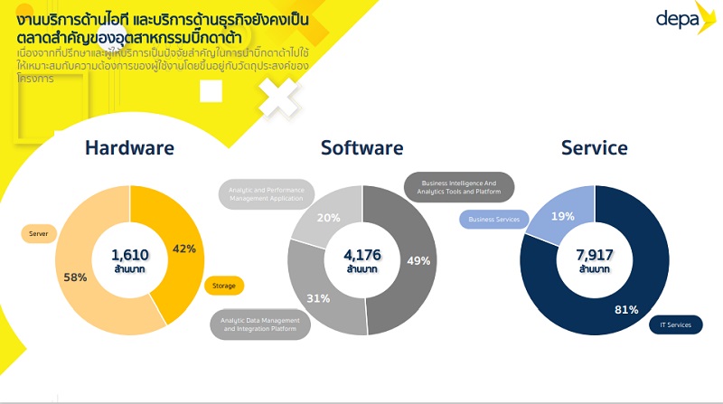 ผศ.ดร.ณัฐพล นิมมานพัชรินทร์ ผู้อํานวยการใหญ่ ดีป้า เปิดเผยว่า ภาพรวมอุตสาหกรรมบิ๊กดาต้า ปี 2563 ขยายตัวร้อยละ 3.99 จากปีก่อน มีมูลค่าอุตสาหกรรมอยู่ที่ 13,703 ล้านบาท แบ่งเป็นมูลค่าจากตลาด ฮาร์ดแวร์ (Hardware) 1,610 ล้านบาท ตลาดซอฟต์แวร์ (Software) 4,176 ล้านบาท งานบริการด้านไอทีและ ธุรกิจ (IT/Business Service) 7,917 ล้านบาท ซึ่งอุตสาหกรรมบิ๊กดาต้าจะยังคงเติบโตต่อเนื่องไปพร้อมกับการ ให้บริการบนคลาวด์