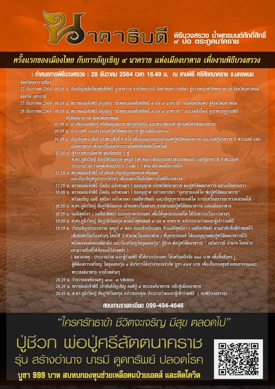 เข้าร่วมพิธีอันยิ่งใหญ่ ครั้งแรกของเมืองไทย พิธี นาคาธิบดี พิธีบวงสรวงอันยิ่งใหญ่ 9 บ่อน้ำพุทธมนต์ศักดิ์สิทธิ์ และอัญเชิญองค์นาคราช 9 องค์นาคราชจากเมืองบาดาล มาร่วมในพิธีบวงสรวง ณ ลาน ศรีสัตตนาคราช นครพนม โดยมีท่านผู้ว่านครพนม เป็นประธานในพิธี