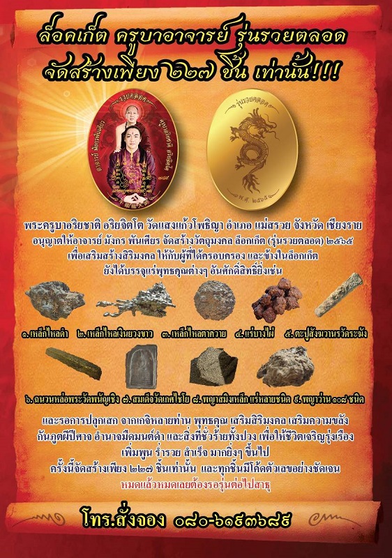 พระครูบาอริยชาติ อริยจิตโต วัดแสงแก้วโพธิญา อำเภอ.แม่สรวย จังหวัด.เชียงราย อนุญาตให้อาจารย์ มังกร พันเศียร จัดสร้างวัตถุมงคล ล็อกเก็ต ( รุ่นรวยตลอด ) ๒๕๖๕ เพื่อเสริมสร้างสิริมงคล ให้กับผู้ที่ได้ครอบครอง และข้างในล็อกเก็ต ยังได้บรรจุแร่พุทธคุณต่างๆ อันศักดิ์สิทธิ์ยิ่งเช่น