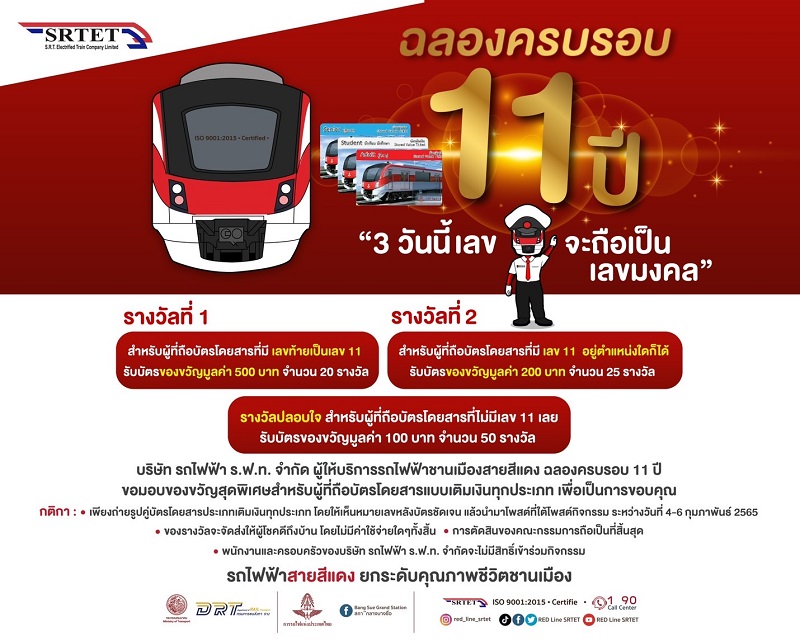 โดยการตัดสินผู้ได้รับรางวัลในกิจกรรมดังกล่าวของบริษัทถือเป็นที่สิ้นสุด ซึ่งผู้โดยสารสามารถติดตามรายละเอียดและร่วมสนุกได้ที่ Facebook RED Line SRTET ระหว่างวันที่ 4 – 6 กุมภาพันธ์ 2565