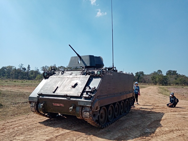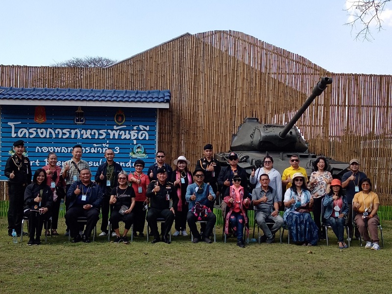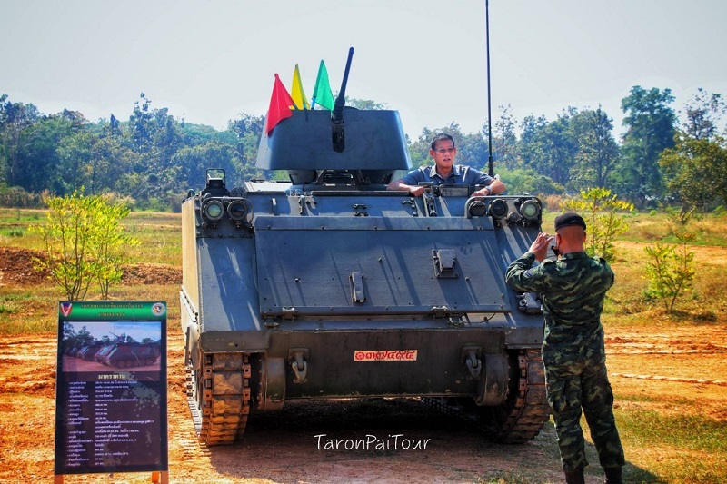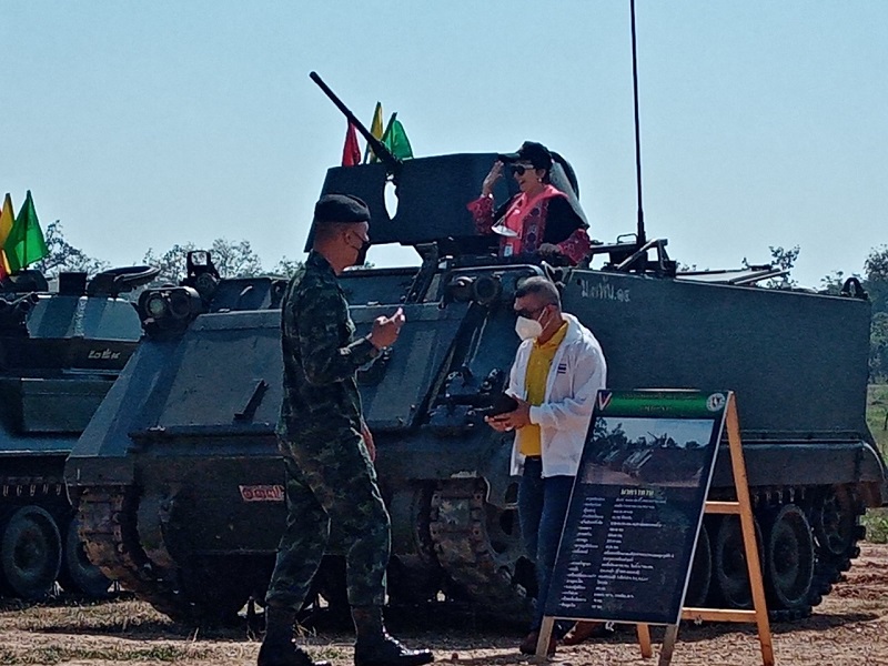 การดูงานเศรษฐกิจพอเพียงแล้ว ทางค่ายยังเปิดโอกาสให้พวกเราได้มีโอกาสขึ้นรถถังของจริง ที่วิ่งในสมรภูมิจริงๆมาให้เราได้ขึ้นไปนั่งชมรอบสนามฝึกซ้อมของรถถังซึ่งถือว่าเป็นทหารม้า หลายคนได้ขึ้นไปเยี่ยมชมกับแบบถึงอกถึงใจ ถือว่าเป็นวันเด็กสำหรับพวกเราอีกครั้ง เสร็จจากการนั่งรถถัง เราก็มาถ่ายรูปร่วมกันในค่ายทหารพันธุ์ดี และพักทานน้ำก่อนที่จะไปทานข้าวกลางวันที่ห้องทดแทนคุณแผ่นดิน กับอาหารมื้อกลางวัน กับบรรยากาศย้อนยุคสู่สมรภูมิเลือด ที่บันทึกเป็นประวัติศาสตร์ชาติไทย ผ่านการบรรยายอย่างลึกซึ้ง จนก้อนสะอื้นมาจุกคอ การเรียนรู้ประวัติศาสตร์อีกครั้ง หลังจากนั้น เราร่วมร้องเพลงบ้านเกิด เมืองนอน ในเวอร์ชั่นค่ายทหารในการสำนึกรักบ้านเกิดตอบแทนคุณแผ่นดินในจิตสำนึกของคนไทย แต่หลายฝ่ายพยายามสร้างความแตกแยกให้เกิดขึ้นในยุคนี้จริงๆ