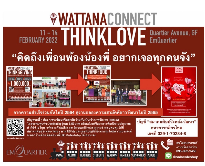 ลิสา นะวงศ์ นายกสมาคม ส.ว.ว. กล่าวว่า “การจัดงาน #ThinkLove ครั้งนี้นับเป็นครั้งแรก และครั้งประวัติศาสตร์ที่ทางสมาคมฯ จัดงานออกร้านในลักษณะนี้นอกสถานที่ ปกติเรามี #WattanaFair ที่โรงเรียนเราทุกปี แต่ปีนี้หลังจากที่ห่างหายกันไปถึง 2 ปี เรากลับมาจัดที่EmQuartier เพื่อความเหมาะสมและสะดวกกับทุกๆ คนค่ะ งานนี้เราได้รับความร่วมมือจากหลายฝ่าย ทั้งทางโรงเรียนวัฒนาวิทยาลัยเอง สมาคมผู้ปกครองและครูโรงเรียนวัฒนาวิทยาลัย มูลนิธิโรงเรียนวัฒนาวิทยาลัย และผู้สนับสนุนรายใหญ่ๆ ของเรา อาทิ บริษัท จระเข้ คอร์ปอเรชั่น จำกัด บริษัท ซินเซียร์ จิวเวลรี่ (ประเทศไทย) จํากัด บริษัท อิตาเลเซีย เทรดดิ้ง (ประเทศไทย) จํากัด และอื่นๆ อีกมากมาย ทำให้เราสามารถจัดงานได้อย่างเต็มที่ โดยมีวัตถุประสงค์เพื่อหารายได้เพื่อสาธารณกุศล โดยรายได้ส่วนหนึ่งจะทูลเกล้าฯ ถวายโดยเสด็จพระราชกุศลตามพระราชอัธยาศัย และสมทบทุนครูเกษียณโรงเรียนวัฒนาวิทยาลัย ฯลฯ