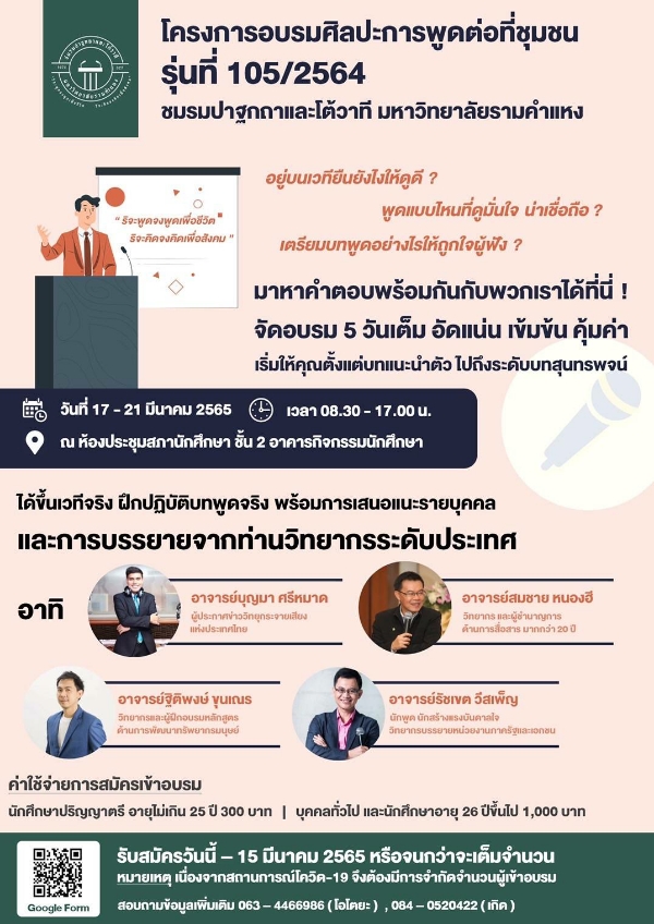 ชมรมปาฐกถาและโต้วาที มหาวิทยาลัยรามคำแหง จัดฝึกอบรมศิลปะการพูดในที่ชุมนุมชน ขั้นพื้นฐาน