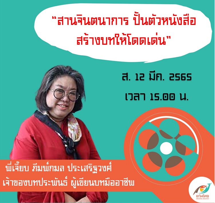หัวข้อ “สานจินตนาการ ปั้นตัวหนังสือ สร้างบทให้โดดเด่น” โดย คุณเจี๊ยบ ภีมพ์กมล ประเสริฐวงศ์ เจ้าของบทประพันธ์และผู้เขียนบท