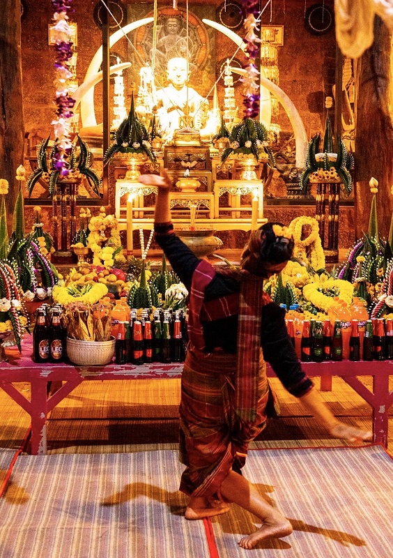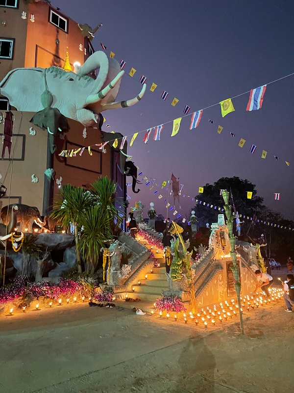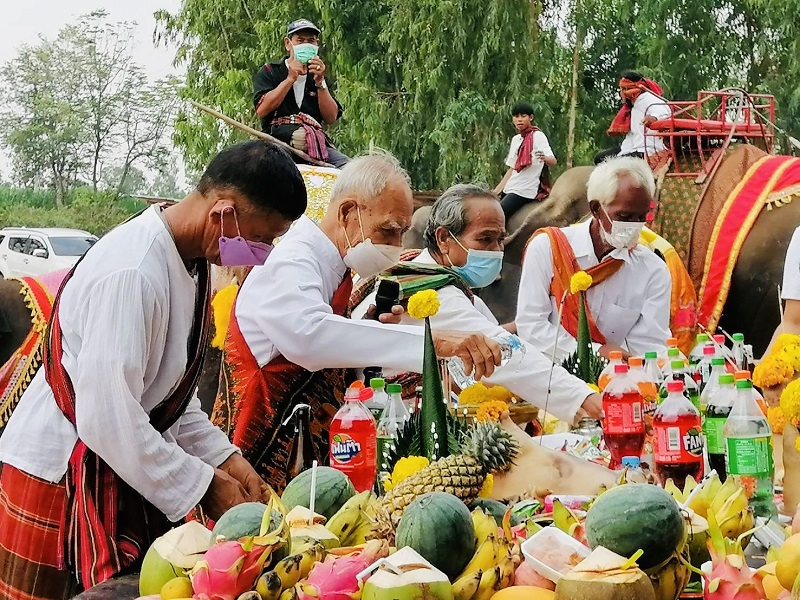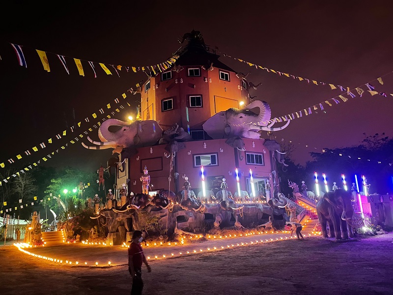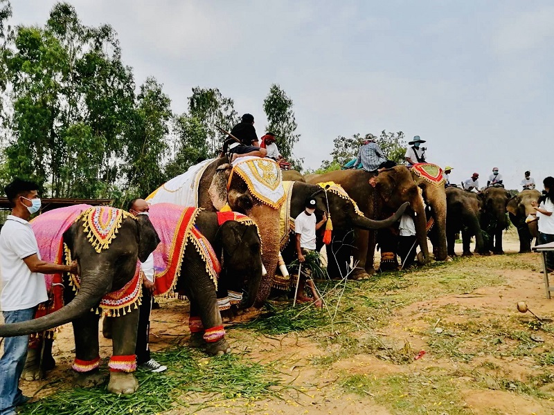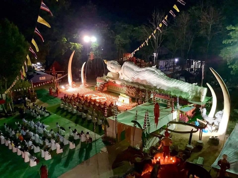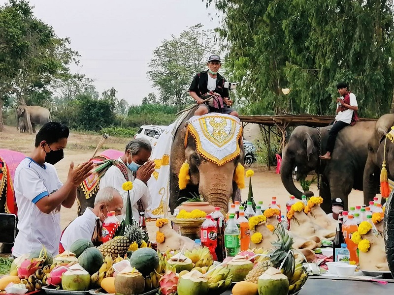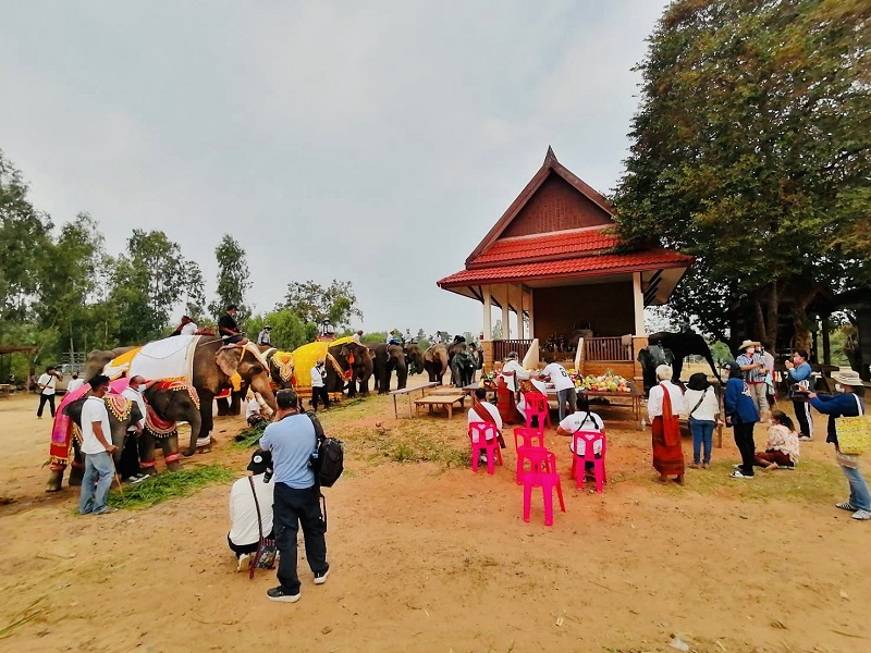 คือเรื่องว่า ที่ “วัดป่าอาเจียง” ชาวชุมชนบ้านหนองบัวเขาช่วยกันดูแลช้างที่ตกงานหรือไม่มีงานทำเนื่องจากในเวลาที่ผ่านมาเมื่อโควิด 19 ระบาดไปทั่วโลกทำให้การจัดแสดงช้างตามจังหวัดต่าง ๆ ต้องปิดตัวลง ควาญช้างจึงนำช้างกลับบ้านตากลาง ทางวัดป่าอาเจียงโดยเฉพาะ ดร.พระอาจารย์หาญหรือท่านพระครูสมุห์หาญ ปัญญาธโร เจ้าอาวาสวัดป่าอาเจียงได้จัดงานภายในวัดป่าอาเจียงเพื่อให้ญาติโยมทั้งหลายเข้าทำบุญหรือบริจาคเงินช่วยเหลือช้างและเมื่อวันเสาร์ที่ 12 มีนาคม 2565 ทางวัดป่าอาเจียง จัดพิธีจุดประทีปรอบองค์พระเจดีย์ช้างสามเศียรหรือช้างเอราวัณ ช่วงเวลาค่ำ ๆ สวยงามและมีมนต์ขลังสร้างความประทับใจแก่ผู้ร่วมงานได้อย่างมากอีกทั้งยังจัดให้พระภิกษุสามเณรสวดมนต์เพื่อทำน้ำพระพุทธมงคลหรือน้ำพระพุทธมนต์เพื่อใช้ประกอบพิธีวันช้างไทย นอกจากนี้ยังมีพิธีกรรมรำบวงสรวงบูชาองค์พระครูปะกำในวิหารวัดป่าอาเจียงด้วย การประกอบพิธีกรรมนี้ควาญช้างหรือคชศาสตร์ชาวกูยถือว่ามีความศักดิ์สิทธิ์เป็นเรื่องเกี่ยวกับช้างโดยตรงครับ