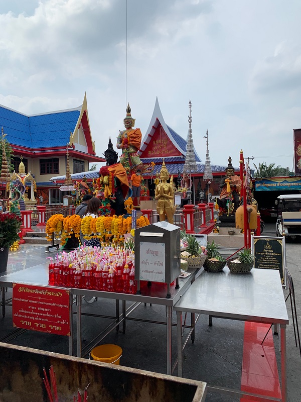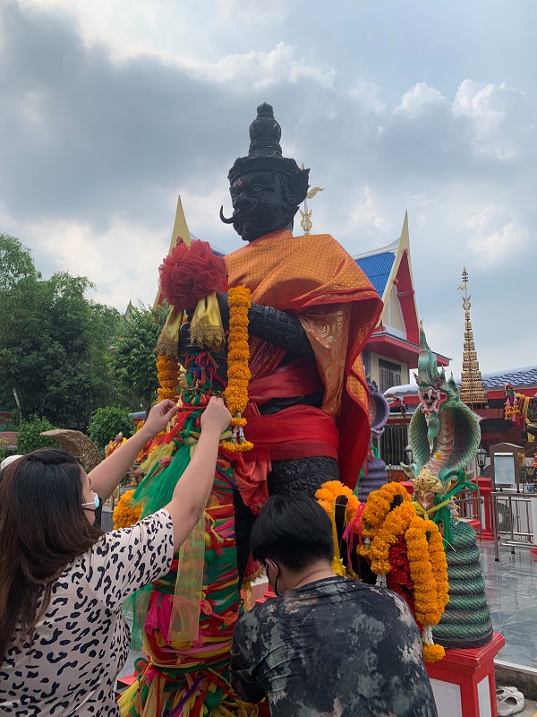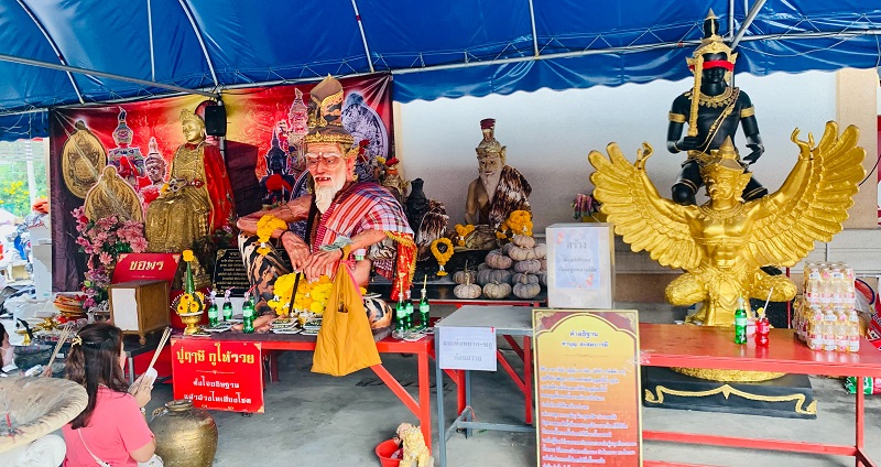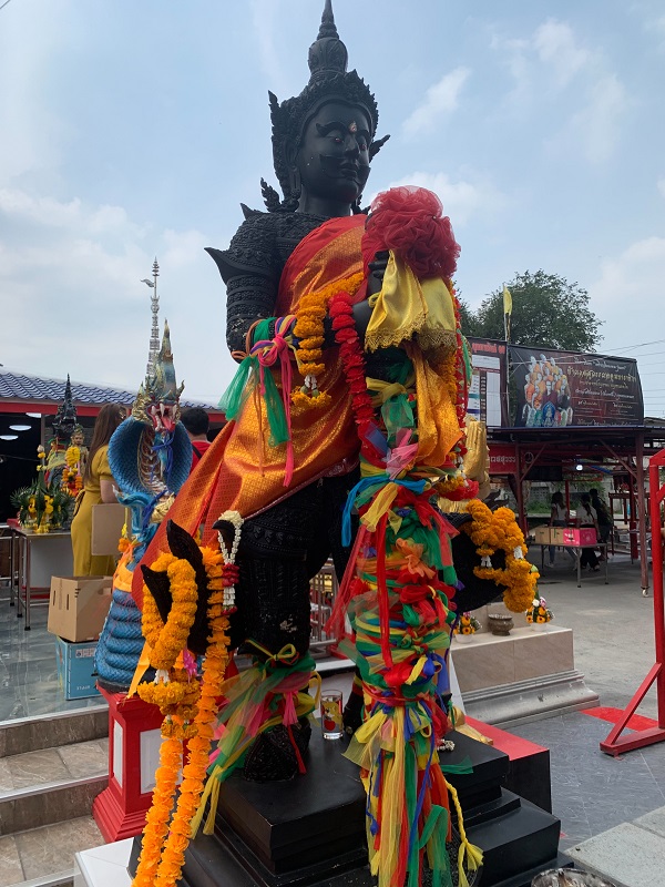 ที่ไหว้จุดธูปเทียนบูชา เขาทำไว้ในร่มตรงหน้ารูปปั้นท่าน ส่วนการผูกผ้าสี3สี ที่องค์ท่าน มีคาถาบูชา ไว้ด้วยตรงหน้า