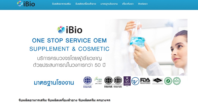 บริษัท ไอไบโอ จำกัด เป็นบริษัทรับผลิตครีม รับผลิตอาหารเสริม รับผลิตเครื่องสำอาง แบบครบวงจรโดยก่อตั้งมากว่า 40 ปี ได้ดำเนินธุรกิจแบบ OEM ที่พร้อมจะทำให้คุณเป็นเจ้าของแบรนด์อาหารเสริมและเครื่องสำอางได้อย่างง่ายดาย ดำเนินงานโดยทีมงานที่มีประสบการณ์ ในการพัฒนาผลิตภัณฑ์ มุ่งเน้นเพื่อตอบสนองความต้องการของลูกค้า ด้วยรากฐานของเทคโนโลยีที่มี ไอไบโอจึงสามารถพัฒนาผลิตภัณฑ์ได้หลากหลาย ตั้งแต่ ผลิตภัณฑ์อาหารเสริม ผลิตภัณฑ์บำรุงเส้นผม ผลิตภัณฑ์ครีมหน้าขาวหน้าใส และผลิตภัณฑ์เครื่องสำอางอื่น ๆ อีกมากมาย พร้อมมาตรฐานระดับสากล GMP และ ISO 9001:2008 ที่มั่นใจได้ นอกจากนี้ ยังพร้อมให้คำปรึกษา ตลอดจนเป็นผู้ผลิตสินค้าพร้อมการออกแบบผลิตภัณฑ์ที่มีเอกลักษณ์ ตอบโจทย์ความต้องการของลูกค้าแต่ละแบรนด์ เพื่อให้ลูกค้าได้รับบริการและผลิตภัณฑ์ที่ดีที่สุดในแบบของคุณเอง