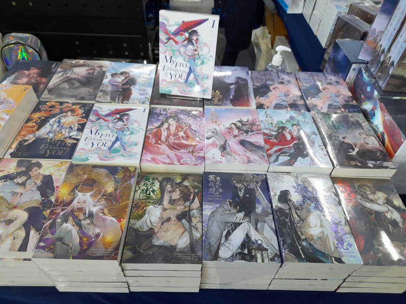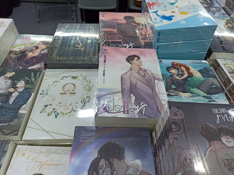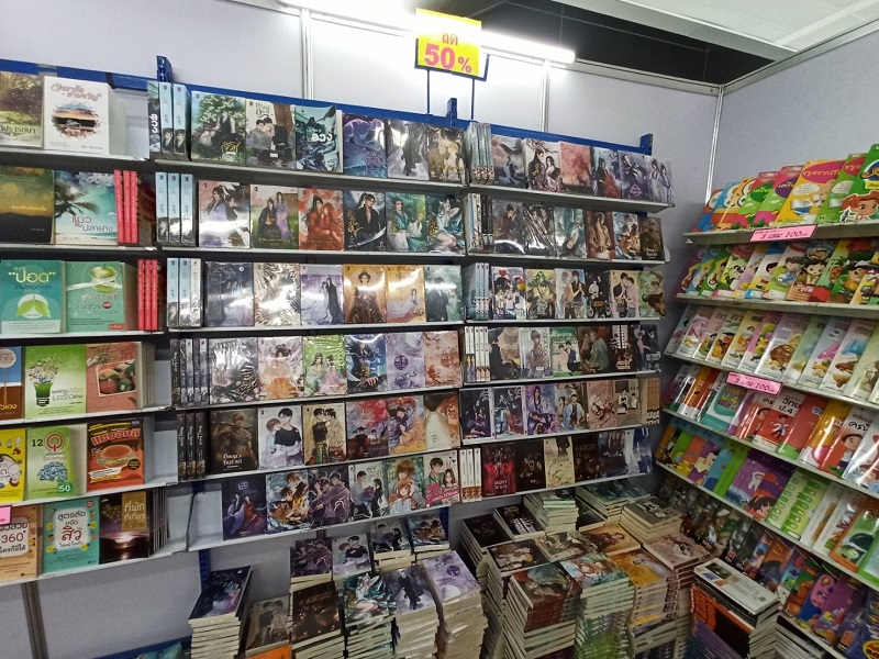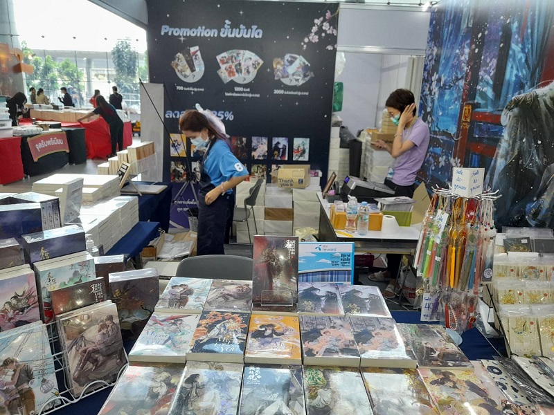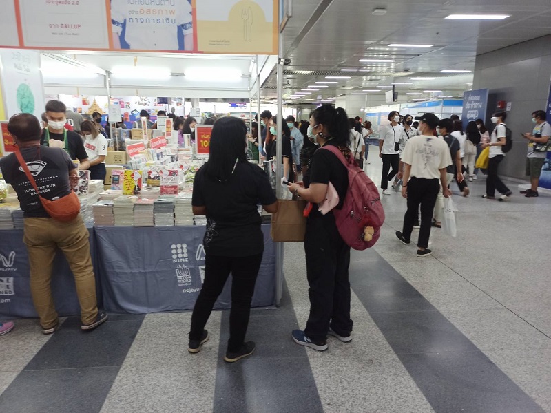 ซึ่งบูธหนังสือก็สำนักพิมพ์หน้าเดิม ๆ ที่เคยมาเปิด แต่ต้องขอติคนจัดงานตั้งป้ายซะใหญ่โตในสถานีรถไฟใต้ดินชี้บอกทาง แต่ป้ายมาหายเหลือป้ายขึ้นไปชั้นฉีดวัคซีนแทน คนที่มางานพอเห็นป้ายฉีดวัคซีนใครจะขึ้นเพราะต่างมางานหนังสือกันทั้งนั้น เลยพากันยืนงงเหมือนเราอยู่ชั่วขณะ จนกระทั่งผู้ร่วมทางเดินไปสุดทางไปเจอเจ้าหน้าที่บอกให้ขึ้นไปชั้นฉีดวัคซีนนั่นแหละ พอขึ้นไปก็ได้เจอบูธต่าง ๆ จากหงุดหงิดที่ป้ายบอกทางไม่ชัดเจนพลอยยิ้มออกพร้อมกระเป๋าเงินสั่นพั่บ ๆ แต่ต้องทำงานก่อนเลยเก็บภาพบูธต่าง ๆ ซึ่งที่เห็นเด่นชัดบูธแรกก็ บูธของเนชั่น จึงเข้าไปทักทายพีอาร์สนิทที่ส่งหนังสือมาลงข่าวโปรโมตในคอลัมน์แกะซีลหนังสือดีไม่เคยขาด พอได้เจอกันพีอาร์ขวัญก็ให้หนังสือมาโปรโมตเดี๋ยวนั้นเลย ก่อนไปไม่ลืมแชะภาพสองพีอาร์ที่คบหาร่วมงานกันมานานหลายปีมาลงข่าว จากนั้นไปเก็บภาพบูธต่อก็เจอบูธหนังสือลดหนัก 50% ซึ่งบูธนี้ไปกี่ปีก็ต้องจัดหนังสือกลับมาปีนี้ก็ไม่พลาดจัดมาหลายเล่มเลย แล้วก็ไปต่อบูธนิยายเจอบูธแจ่มใส บูธศูนย์หนังสือจุฬา บูธสำนักพิมพ์ที่เห็นเยอะสุดคงเป็นนิยายวายก็เลยสอยนิยายวายลดเหลือเล่มละ 50 บาทมา 2 เล่มเป็นเรื่องที่อยากอ่านพอดี แต่ก็ไม่ลืมแชะภาพมาฝากเผื่อสาววายจะแวะไปสอยบ้าง