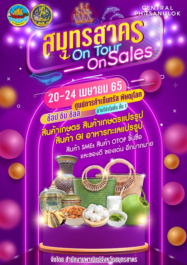 สำนักงานพาณิชย์พาณิชย์จังหวัดสมุทรสาคร ขอเชิญชวนพี่น้องชาวจังหวัดพิษณุโลก ร่วมงาน “สมุทรสาครออนทัวร์ On Sale 2565” ซึ่งจัดขึ้นระหว่างวันที่ 20-24 เมษายน 2565 ณ ลานโปรโมชั่น ชั้น 1 ศูนย์การค้าเซ็นทรัล พิษณุโลก ทั้งนี้งานดังกล่าว เป็นการช่วยสร้างรายได้ให้กับผู้ประกอบการ และกระตุ้นเศรษฐกิจให้กับพี่น้องประชาชนในพื้นที่จังหวัดสมุทรสาคร โดยภายในงาน เป็นการยกทัพสินค้าคุณภาพจากจังหวัดสมุทรสาคร มาจำหน่ายมากมาย ให้พี่น้องชาวพิษณุโลกได้จับจ่าย ทั้งกลุ่มสินค้าเกษตร สินค้าเกษตรแปรรูป สินค้า GI อาหารทะเลแปรรูป สินค้า OTOP SME ขึ้นชื่อ และของดี ของเด่น อาทิ มะพร้าวน้ำหอมบ้านแพ้ว ผลิตภัณฑ์แปรรูปจากมะพร้าว ไอศกรีมกะทิ มะพร้าวอ่อนสุดฟิน น้ำตาลมะพร้าว ปลาทูซาเตี๊ยะ กุ้งแห้งตัวโตๆ คัดพิเศษ กะปิเคยรสดี อาหารทะเลแห้ง งานหัตถศิลป์ เครื่องเบญจรงค์ น้ำจิ้มสุกี้พันทายนรสิงห์ การันตีด้วยความอร่อยยาวนานกว่า 60 ปี และอื่นๆ อีกมากมาย