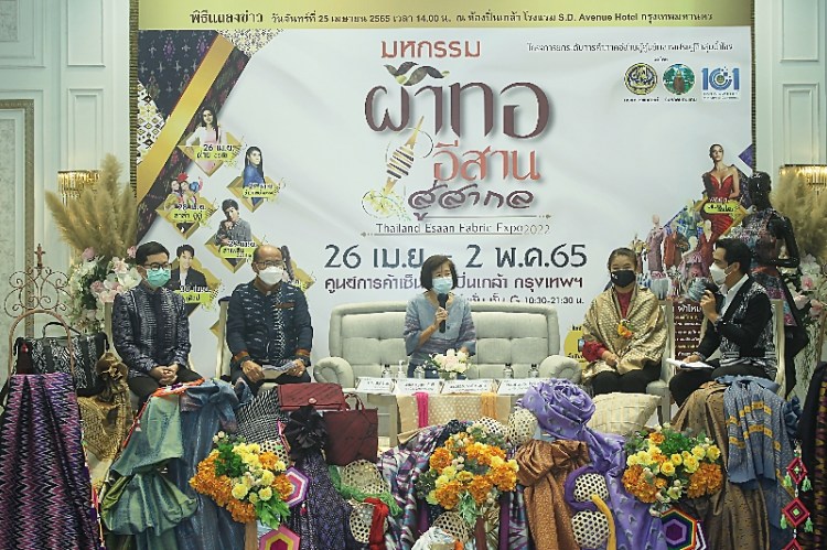 ดังนั้น กระทรวงพาณิชย์ จึงได้กำหนดกิจกรรมการจัดงาน “มหกรรมผ้าทออีสานสู่สากล Thailand Esaan Fabric Expo 2022” ขึ้น ระหว่างวันที่ 26 เมษายน – 2 พฤษภาคม 2565 จ านวน 7 วัน ณ ลานโปรโมชั่น (หน้าลิฟท์แก้ว) ชั้น G ศูนย์การค้าเซ็นทรัลปิ่นเกล้า กรุงเทพมหานคร โดยมีเป้าหมายผู้เข้าร่วมงาน ได้แก่ ผู้ผลิต/ผู้ประกอบการสินค้าผ้าทอ จากจังหวัดภาคตะวันออกเฉียงเหนือ ไม่น้อยกว่า 40 ราย รวม 40 คูหา เพื่อเป็น การส่งเสริมและขยายช่องทางการตลาด และเพิ่มขีดความสามารถในการแข่งขันให้กับชุมชนและผู้ประกอบการอย่าง ครบวงจร ให้สามารถแข่งขันได้ทั้งในระดับประเทศและต่างประเทศ ซึ่งได้มีการแถลงข่าว เมื่อวันที่ 25 เมษายน 2565 ณ โรงแรม S.D.Avenue Hotel กรุงเทพฯ โดยมีนางวรรณภรณ์ เกตุทัต ผู้ตรวจราชการกระทรวงพาณิชย์/ นายชาญยุทธ วันดี พาณิชย์จังหวัดขอนแก่น / นายนิยุทธ์ สืบสาย หัวหน้ากลุ่มงานส่งเสริมการประกอบธุรกิจการค้าและการตลาด ส านักงานพาณิชย์จังหวัดขอนแก่น ร่วมในการแถลงข่าวครั้งนี้