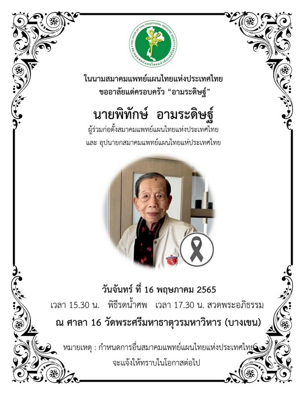 สมาคมแพทย์แผนไทยแห่งประเทศไทย ขอไว้อาลัยและขอแสดงความเสียใจกับครอบครัวอามระดิษฐ์ ที่ได้สูญเสีย นายพิทักษ์ อามระดิษฐ์ อายุ 92 ปี ผู้ร่วมก่อตั้งสมาคมแพทย์แผนไทยแห่งประเทศไทย และอุปนายกสมาคมแพทย์แผนไทยแห่งประเทศไทย
