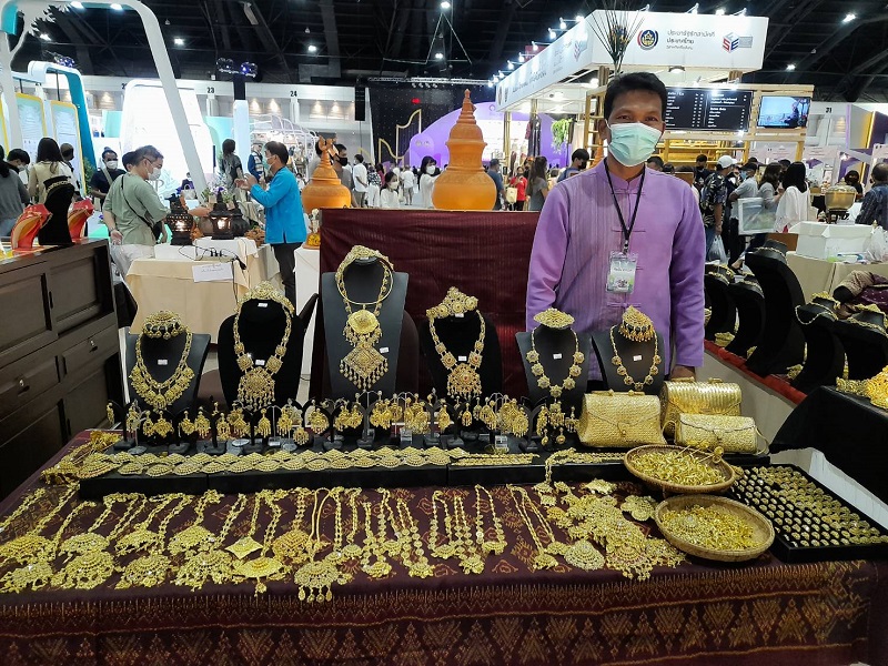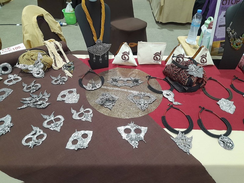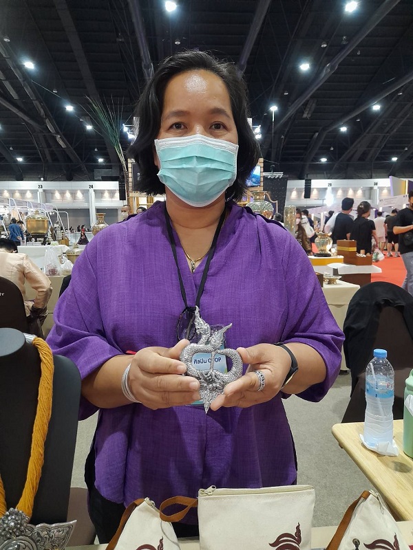 อีกผลิตภัณฑ์เป็นเครื่องประดับทำจากดีบุก โดย เบญจมาพร เล่าว่า “อันนี้เป็นดีบุก จากกำแพงเพชรค่ะ คุณสมบัติของดีบุกมันจะไม่ดำแต่มันจะต้องทำหนากว่าเงิน เขาจะมีความอ่อนกว่าเงินน่ะค่ะ แต่จุดเด่นเขาคือ ‘ไม่ดำ’ ค่ะ ที่ขายดีก็หัวรัดซิ่นพญานาค หัวรัดซิ่นลายไทย เพราะเดี๋ยวนี้คนจะนิยมผ้าไทยใช่มั้ยคะ เราก็จะทำตอบสนองกลุ่มผ้าไทย เราก็หวังให้ยอดดีขึ้นพร้อมกับได้มาโปรโมตสินค้า และเราได้มีโอกาสทำเครื่องประดับให้ แต้ว ใส่ในละครนาคีด้วยค่ะ”