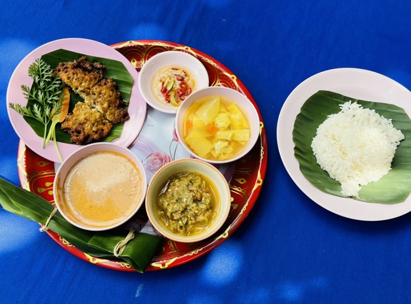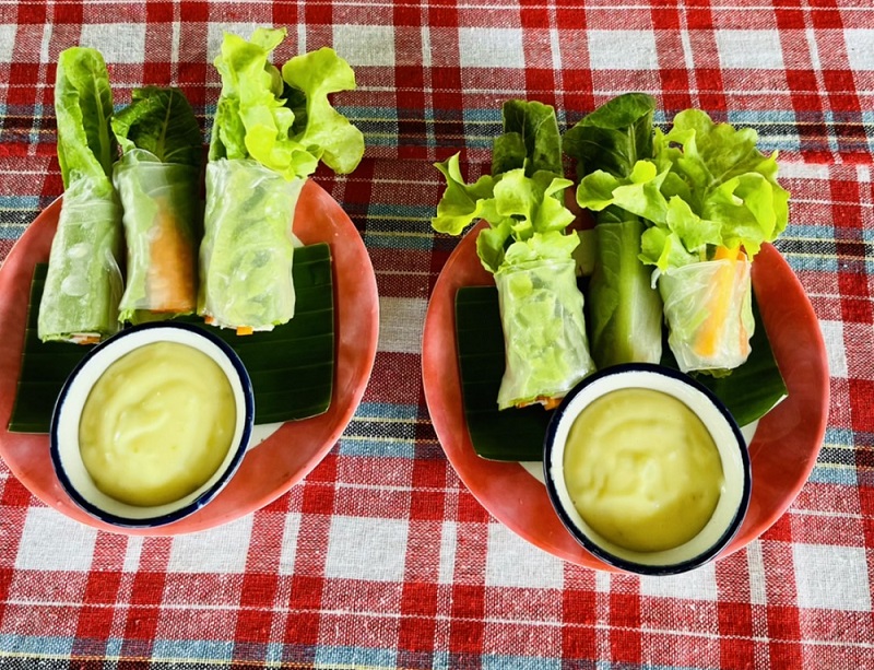 เสร็จจากเที่ยวเกษตร กินผักซื้อผักปลอดสารโดยเฉพาะผักสลัดขึ้นชื่อของวังน้ำเขียวที่ว่าไปแล้วนี่ว่าใครไปใครมาก็ต้องอยากกินอาหารท้องถิ่นที่มีผักสดปลอดสารเคมีแกล้มทุกเมนู จะไปกันเป็นหมู่คณะแบบกลุ่มสัมมนาประมาณ 40-50 คน บ้านสุขสมบูรณ์ก็สามารถรองรับได้ โดยที่นี้จะจัดกิจกรรมให้นักท่องเที่ยว เช่น การทำสลัดโรลล์ เมนูยอดฮิตติดเทรนด์อาหารสุขภาพ ที่นี่เขาใช้เส้นก๋วยเตี๋ยวแช่น้ำมาพันม้วนกับผักสดเป็นม้วนๆใส่ถ้วยเล็กกินกับครีมซีฟู้ดเป็นน้ำจิ้ม อร่อยมากครับ มื้อกลางวันเลยจัดใส่ถาดเป็นชุดๆ มีน้ำพริกปลาป่น ต้มจืดหน่อไม้ ไข่เจียว ขนมจีนน้ำยา ตามมาจัดเต็ม ขอบอกเลยว่าเมนูสุดฟินแบบนี้พลาดไม่ได้นะครับโดยเฉพาะน้ำพริกปลาป่นจิ้มกับผักสดๆ นานาชนิด อู้ฮู!!! ผักสดกรอบสุดๆ ถูกใจกันถ้วนหน้า