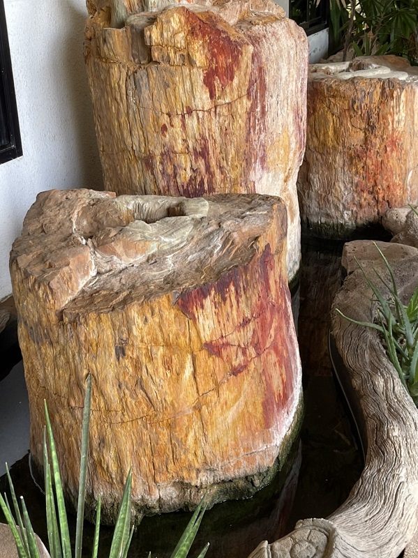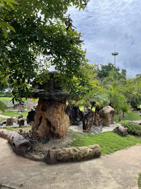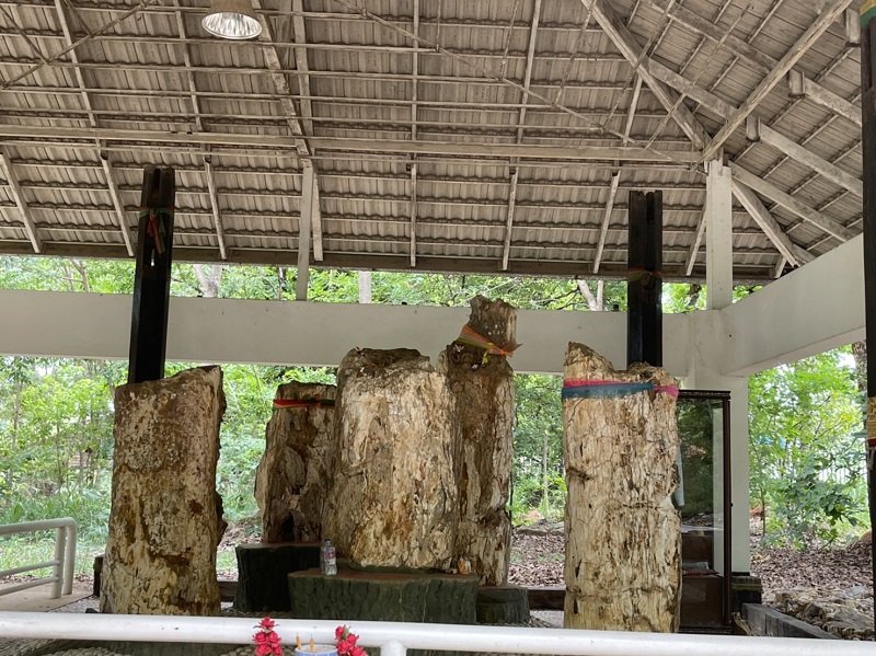เสร็จแล้วนั่งรถรางให้ชมร่องรอยการขุดพบเจอไม้กลายเป็นหิน ซึ่งพบมากในบริเวณนี้ เพราะเชื่อว่าต้นไม้ขนาดใหญ่อายุมากกว่า 100,000-1,000,000 ปี มีเทพสถิตอยู่เลยต้องตั้งเป็นศาลบูชาสักการะเทพที่อยู่